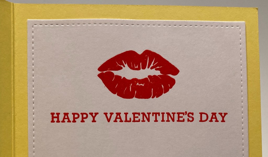 Saying “pucker up” doesn’t quite make this a Valentine, so I stamped the Lips (from the LFL August ’17 kit) and the sentiment (from the HA January ’19 kit) with Candied Apple Distress Oxide ink and embossed both with Clear embossing powder. Nice wet, juicy lips! I don’t think I’ve seen many Yellow Valentines, and this one is very playful and unexpected!