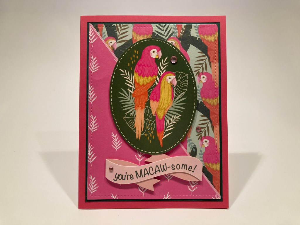 This one makes me giggle! Perfect pun, and another Super-Pink card! I die-cut the two pattern papers with a LFSRdie (3.75″ x 5″), cut the pink one in half diagonally, and glued that atop the parrot pattern paper. I added a thin Dark Green mat and a Pink peel off and glued those to the Cerise Pink card base. The card topper is added to the card front with foam tape. I created this sentiment using my Silhouette Software, the Noteworthy font, and a banner pattern – I cut four background pieces in a darker Pink and two sentiment pieces on some lighter Pink card stock. I glued all the layers together for a very dimensional sentiment, and glued that down to the card front. A few Pink gems add a little more sparkle… and theses Bright Pink Parrots are certainly macaw-some!
