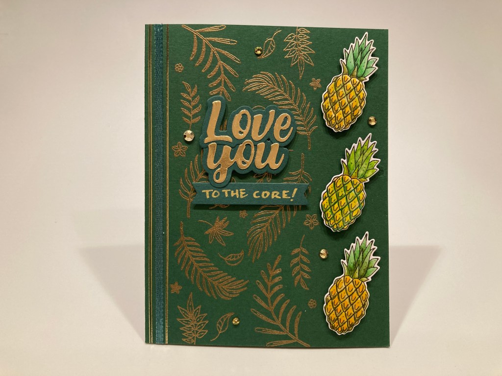 I stamped the foliage directly on the Dark Forest Green card base using VersaMark ink and embossed it with the LFL Golden Crown embossing powder – really sharp! I added a piece of the Green ribbon and two peel offs to the left of the stamping for a nice edging on the card front. I stamped, colored and die-cut two more pineapple and added them to the right of the stamping with foam tape.