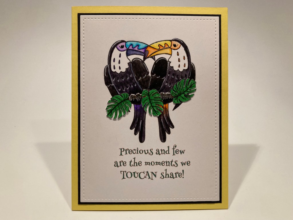 I stamped the sentiment with VersaFine Onyx Black ink and embossed it with clear embossing powder. I wish these sentiment stamps were just a little bit bigger – the scripty “Toucan” becomes a little hard to read at this size. I added the toucans with foam tape and we have a double pun – Toucan achieve anything = You can achieve anything OR Two can achieve anything! HA! I think the leafy background stamping at least suggests perches for our birds… and the unconventional coloring is really a blast! Definitely right in line with the colorway of this kit!