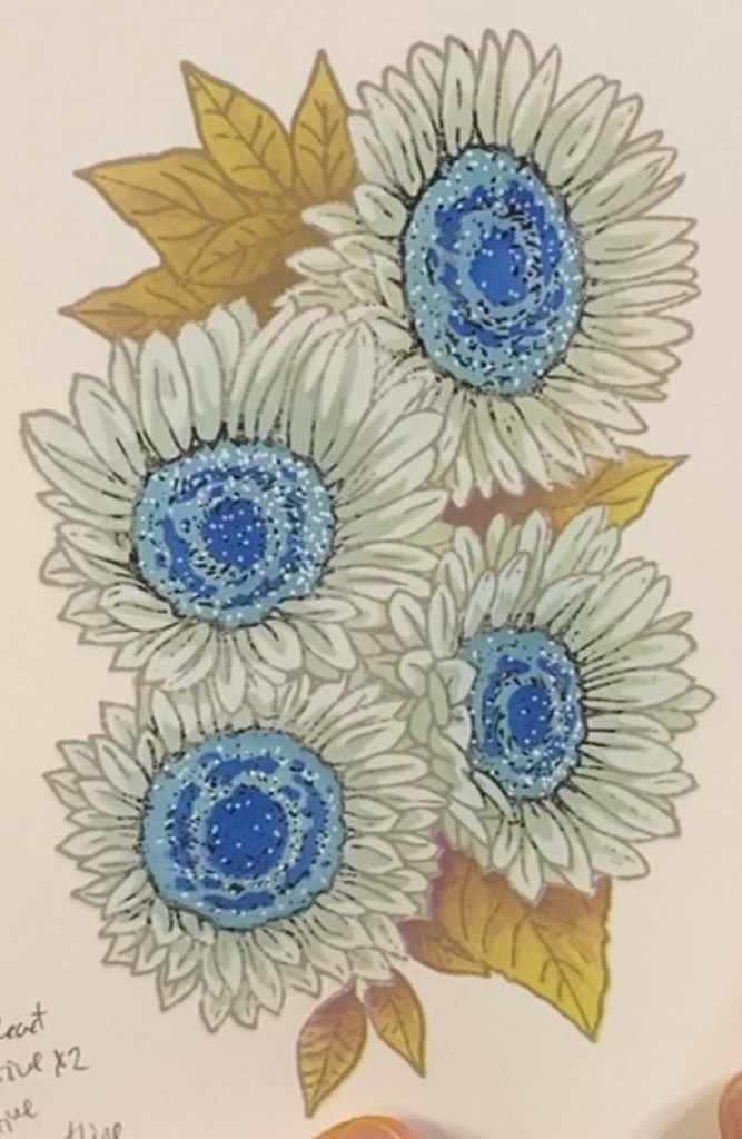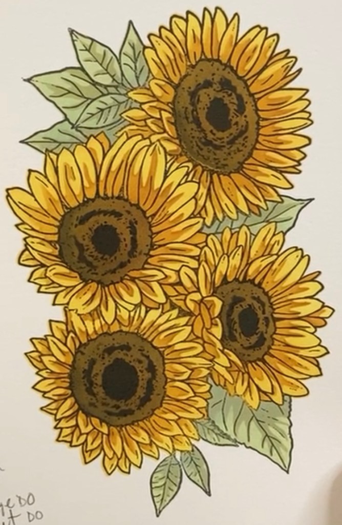 (H) And this is my watercolored piece. I did use an assortment of Daniel Smith watercolors from my big stash of watercolor dot cards. I enjoyed watercoloring this quite a bit – put some music on and took my time layering up all the colors. This is so nice, and probably the most realistic rendering of these sunflowers.