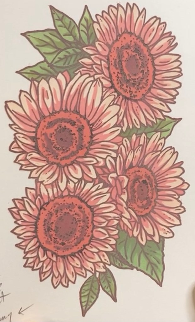 (E) How about some pinks! These are all Distress oxide inks. Tattered Rose (1) Worn Lipstick (2) Abandoned Coral (3) Bundles Sage (4) Aged Mahogany and Peeled Paint (5). I stamped the outline using the Aged Mahogany ink and added some black touches to the centers with Intense Black ink. They almost doin’t look like sunflowers at all!
