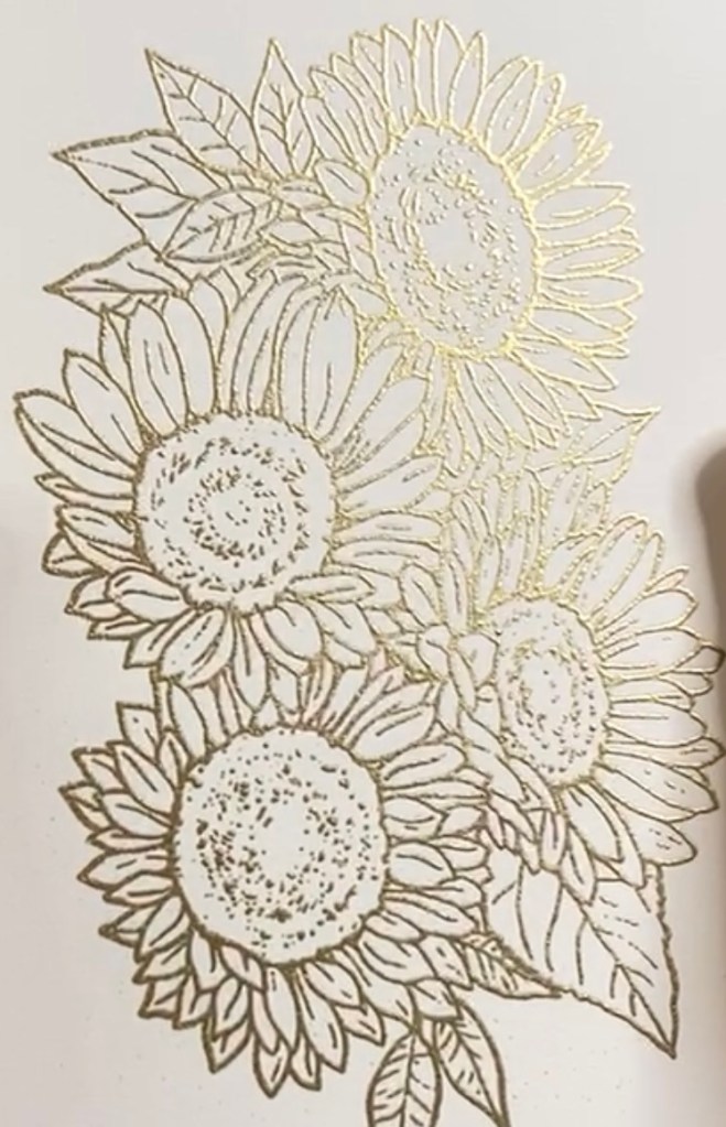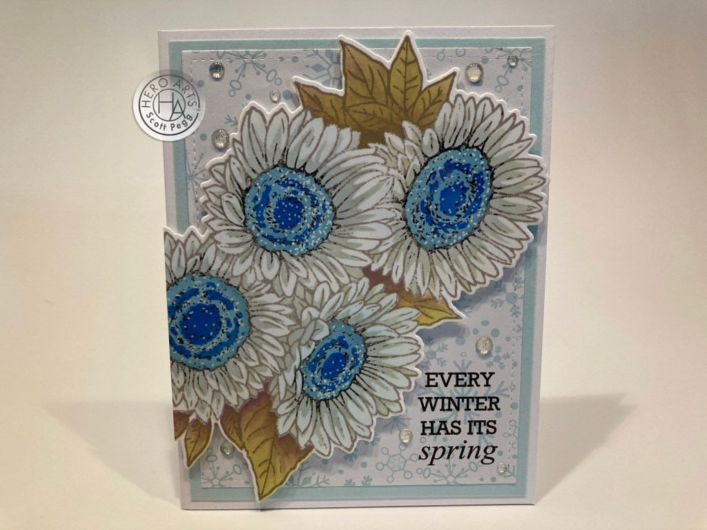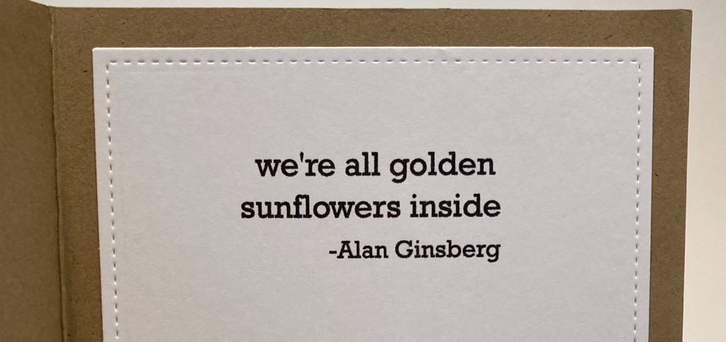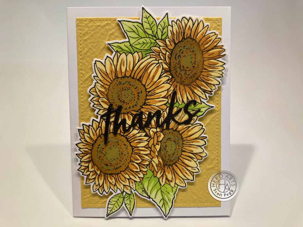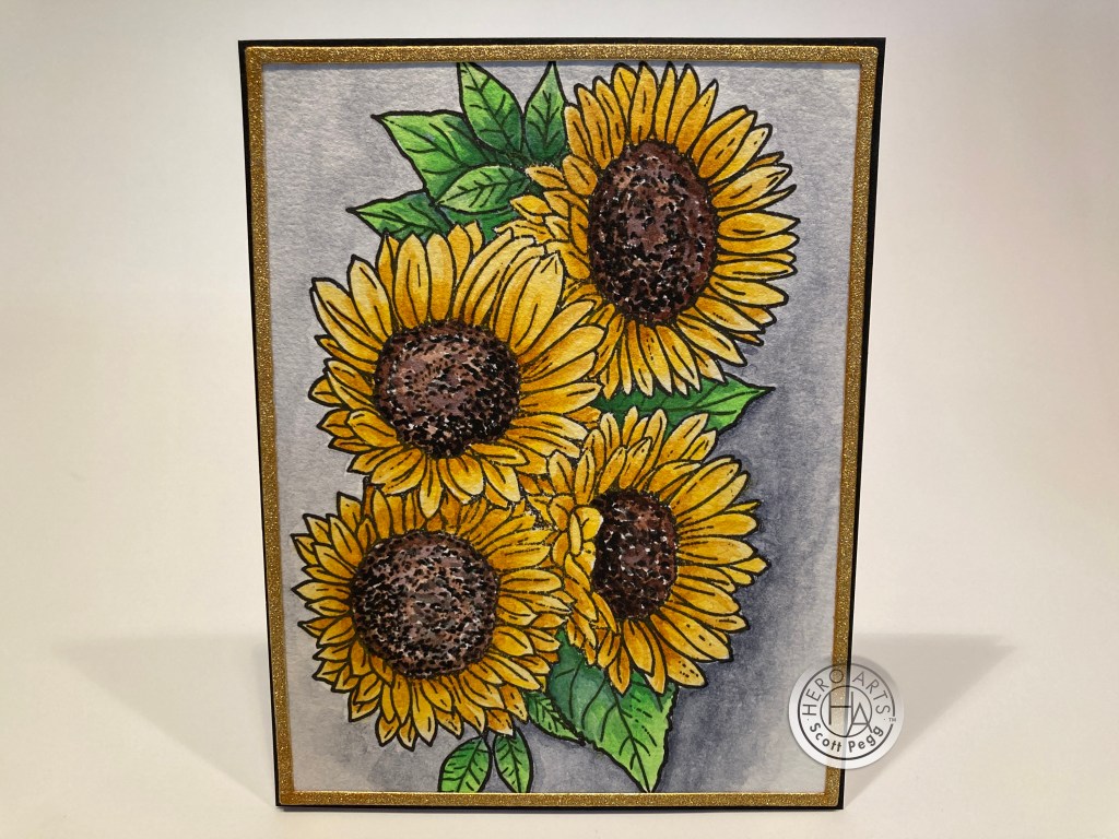 I did also stamp the sunflowers using HA Embossing and Watermark ink and embossed that with some Hero Arts Gold embossing powder. White and Gold always go well together, and this stamp actually has enough detail that you don’t even HAVE to color it for an eye-catching focal point.