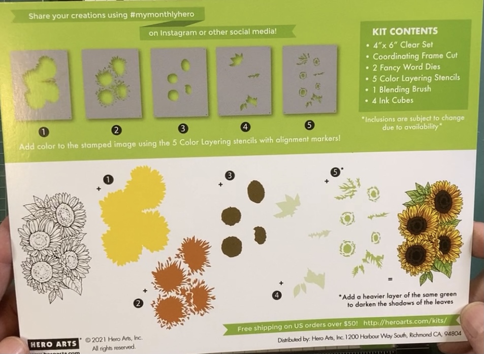 This kit is still available at Hero Arts! If I hope I’ve managed to catch your eye or spark your imagination and you’d like to grab one for yourself! This kit is a greater than normal value this month with all the stencils and ink cubes and blending brush, and if you like sunflowers, then this set should be in your stash! Please use my links if you do go shopping at Hero Arts! It is always terrifically appreciated and helps maintain this website throughout the year!
