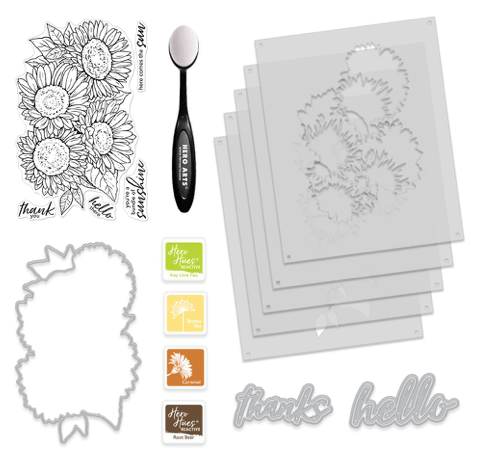 I think this kit is the first of its kind for My Monthly Hero! We get a 4″ x 6″ stamp set with a large cluster of sunflowers and four sunny sentiments. A matching frame cut for those flowers and two Fancy Word Dies – “thanks” and “hello” – both with a shadow die as well. The big kicker this month is the set of Five Layering Stencils that will actually color the whole sunflower stamp. I think this is the first set of Layering Stencils I have in my stash! To assist with our stenciling, we also get a small HA Blending Brush and 4 Ink Cubes (Key Lime Fizz, Butter Bar, Caramel, Root Beer). I’m eager to play with those layering stencils…!