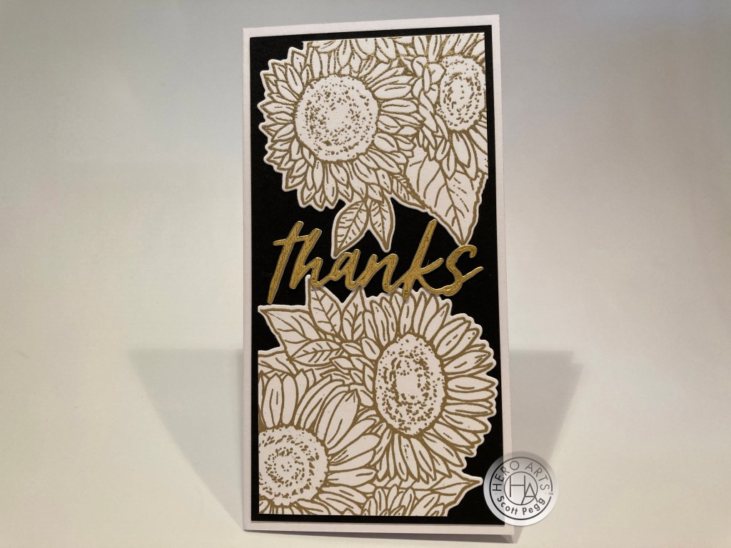 I mentioned how large that sunflower stamp is, but it works wonderfully on a mini slimline card! This is a 3.25″ x 6.25″ card base with a 3″ x 6″ piece of black card stock glued to the front. I cut the sunflowers in half horizontally, and trimmed thin pieces off the sides to make the opposite corners square. The top flowers are the bottom of the stamp and the bottom flowers are the top of the stamp. I glued the embossed flower pieces flat to the card front leaving a little black “mat” showing around the flat edges. I die-cut the “thanks” die from a piece of white card stock and a piece of textured gold card stock and glued them together and then down to the card front. This is actually most of the stamp here – just a small amount of trimming to make the right angles.. There’s a little dimension with the sentiment, but pretty much a flat card. Black White and Gold – a very classy thank you card!