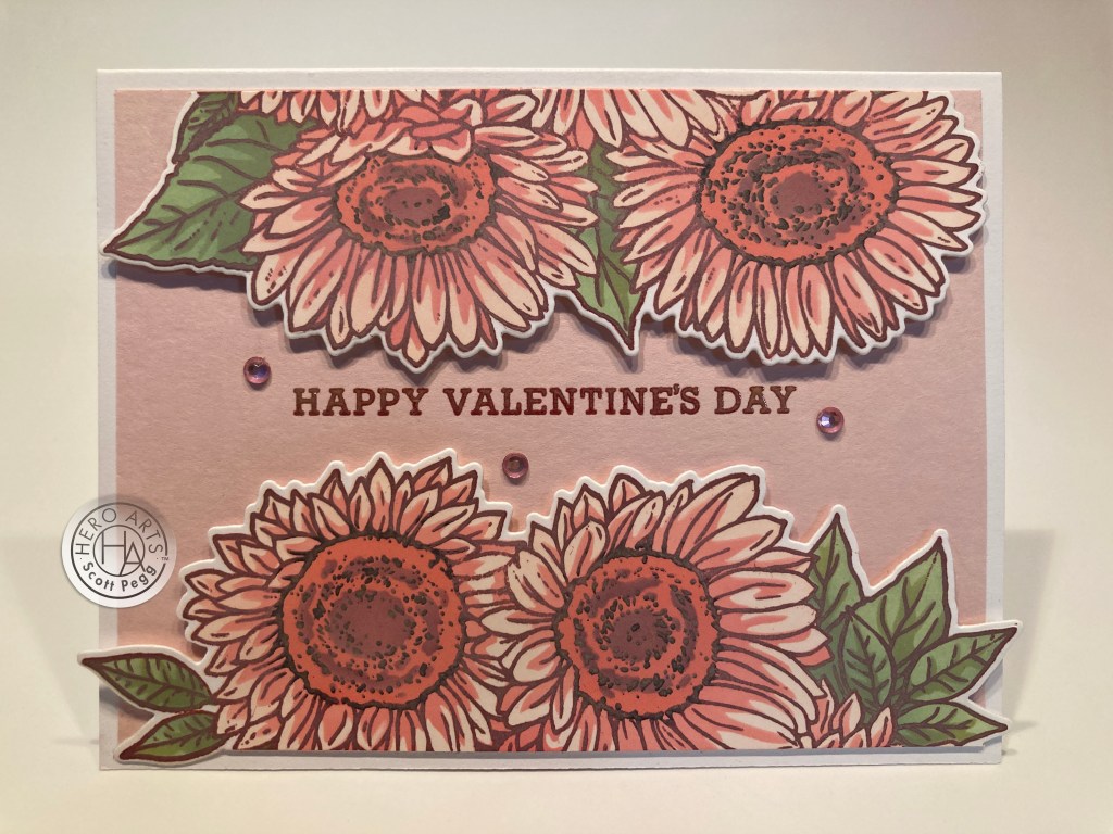 I die-cut panel (E) with the matching die and cut it right down the middle – top to bottom – leaf to leaf! I cut a piece of HA Peony card stock to 4″ x 5.25″ and glued that to a White card base. The sentiment (from the MMH January 2020 Kit) using Aged Mahogany Distress oxide ink (same as the flower outlines) and embossed that with some clear embossing powder. I glued the flowers flat to the card front on the straight edges and added foam tape behind the flowers for a little dimension. A few pink gems add some extra sparkle, and this is another fun arrangement of this stamp! This would be a terrific valentine for anyone addicted to pink!