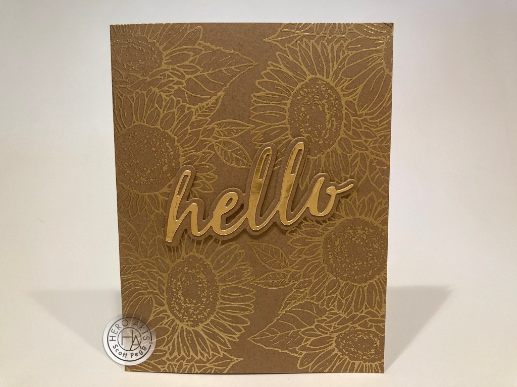 On a Kraft card base, I stamped the bottom of the sunflowers in the top left and bottom right corners using Embossing and Watermark ink and HA Gold embossing powder. I stamped the top of the sunflower stamp in the top right and bottom left corners and gold embossed them as well. That almost fills the whole card up right there! I die-cut the “hello” shadow three times from matching Kraft card stock and glued those together. Then I die-cut the “hello” die from some smooth gold card stock and glued that to the shadow layer and then flat to the card front.