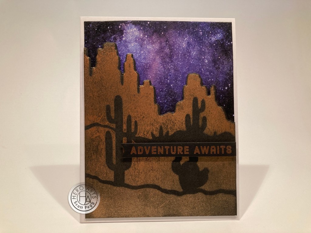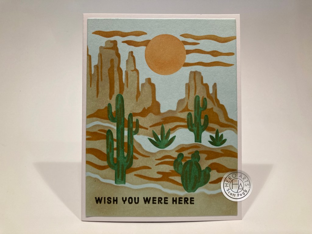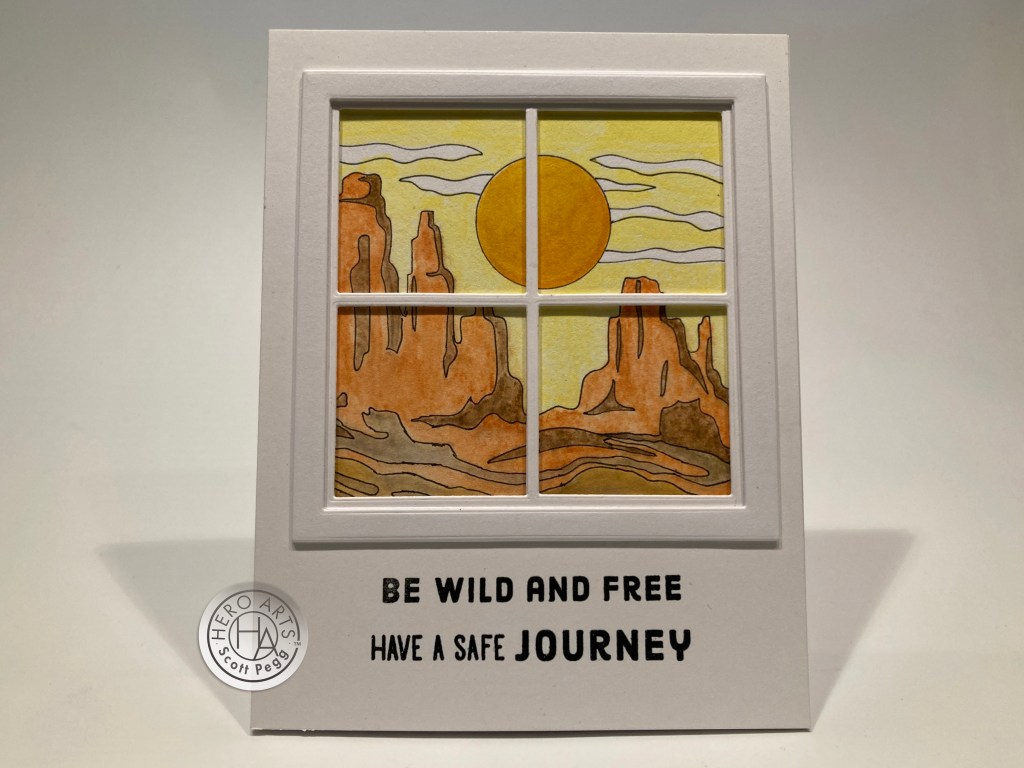 I stamped the sentiment using Hero Hues Root Beer Reactive ink and embossed that with some clear embossing powder. I die-cut the panel with the next-to-the-largest HA Rectangle Infinity die and glued that down to a White card base. Basically, a one-layer card! I think the wash of blue provides a good justification for this sentiment. Now, saguaro cactus (the ones with “arms”) only grow in the Sonoran desert, which is in southern Arizona, but this scene reminds me more of Monument Valley (Utah) than of Arizona.