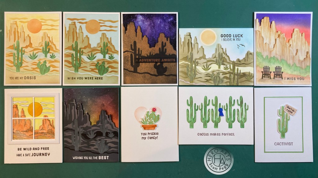 Hello Folks! Scott here with my 10 cards created using the My Monthly Hero August 2022 Kit! “Adventure lies ahead” with this desert southwest themed kit that creates beautiful vistas and detailed landscapes with the kit’s layering stencils. A plethora of possibilities await.
