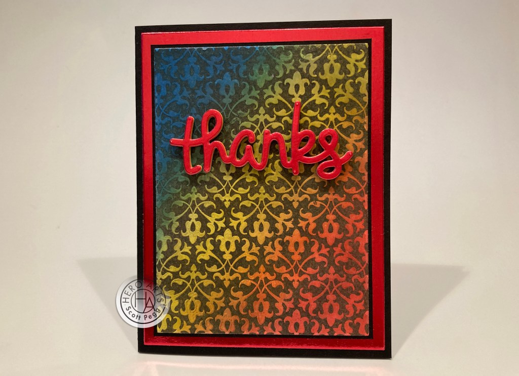On a Pitch Black A2 card base, I added a 4″ x 5.25″ mat of the metallic Red card stock and glued the rainbow panel to the top. Nothing autumnal about this card, but you know this rainbow makes me happy, and the “thanks” is perfectly on theme for this kit. I do love that background stamp!