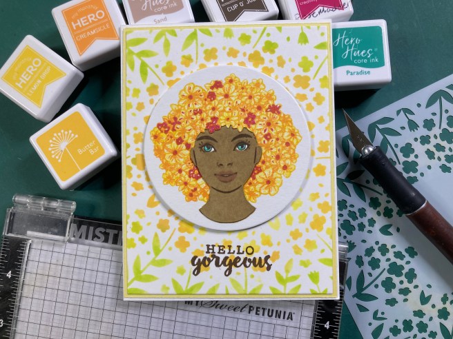 I used the Flower Circle Stencil for the background using Butter Bar, Lemon Drop and Key Lime Fizz inks, and the sentiment is stamped with Cup O’ Joe (FUNNY GIRL is currently running on Broadway, and I couldn’t resist the Hello Gorgeous!). I die-cut the background with a Nesting Rectangle die and added a thin mat of Canary cardstock to the back. I die-cut my Flower Girl with a Circle Infinity die and and cut four more blanks to give that circle some dimension without having to use foam tape.
