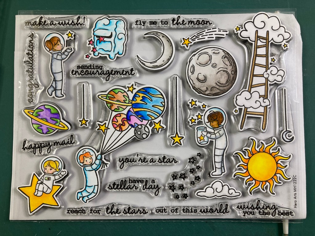 Hello Folks! Scott here with my 10 cards created using the My Monthly Hero December 2022 kit! We are headed skyward this month with a kit featuring a big Celestial Cling Stamp, stars, moons, planets, galaxies, and some cute “space cadets” (Hero Arts terminology – not mine!)