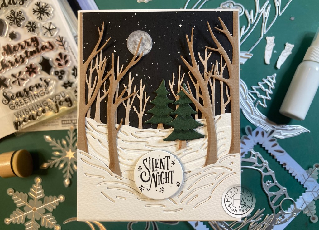 I trimmed the whole “sky” completely away from the third Fancy die… leaving just the trees, and then die cut (and fussy-cut) more of those trees and glued those behind the snow to add some fill to the forest! I spattered a 4 1/8″ x 5 3/8″ piece of Pitch Black card stock using the White Acrylic spray, and glued all the die cut layers on top (trimming where necessary). The moon is the Slate die cut from card #2 that I painted with more of the White Acrylic Spray – just put some on an acrylic block and painted from that. Really good opacity with that paint! Nice bright white! I glued the moon in place behind all the trees.