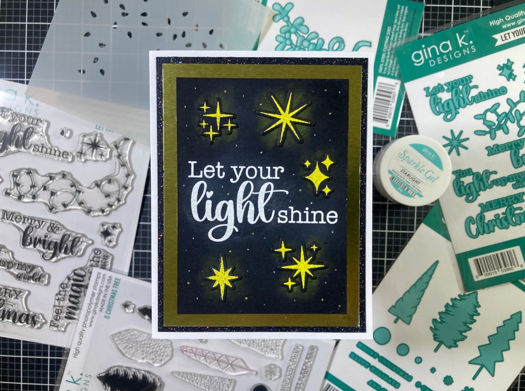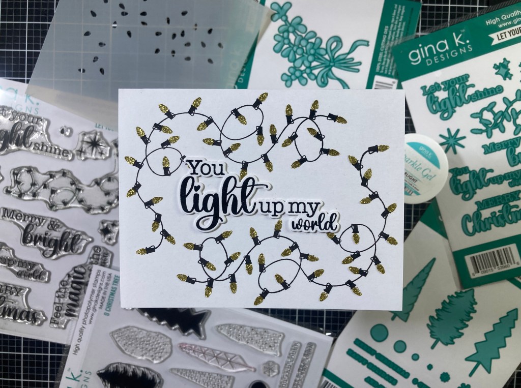 These light bulbs are stenciled with Gina K. Designs Gold Glitz glitter gel – even more reflective than the Starlight Sparkle Gel! Again, I did have to wait for one string to dry before stenciling the second string. The sentiment is stamped with VersaFine Onyx Black ink and embossed with Clear embossing powder, die-cut along with two blanks and glued together and then down to the card front. I like that this sentiment isn’t necessarily a Christmas greeting – though it could be used for the holidays, it doesn’t have to be! Those little light strings are freakin’ adorable!