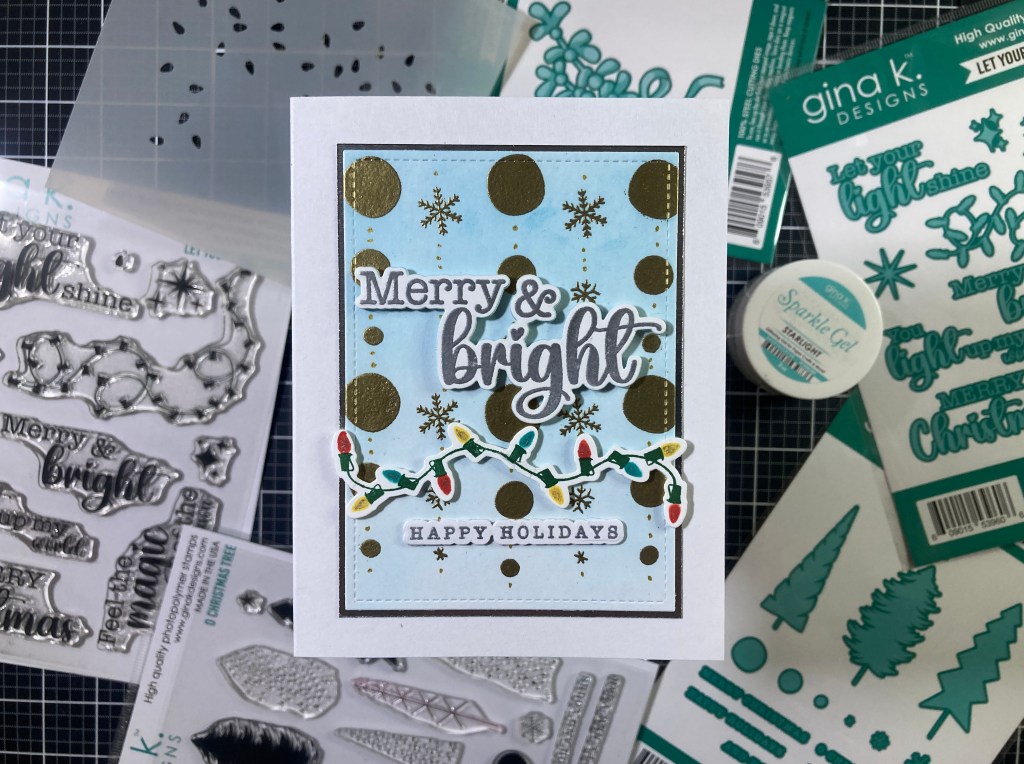 I do believe Gina suggested die-cutting the string before stenciling the light bulbs, so that’s what I did. I stamped the string of lights twice using C&9th Evergreen ink and die-cut them out with the matching die. Then I stenciled the light bulbs with C&9th Poppy, Buttercup, and Oceanside inks. Instead of using the Sparkle Gel again, I chose to “color” in all the bulbs with a GellyRoll Stardust Sparkle gel pen – a little more obvious on top of the colors, but a good amount of shine!