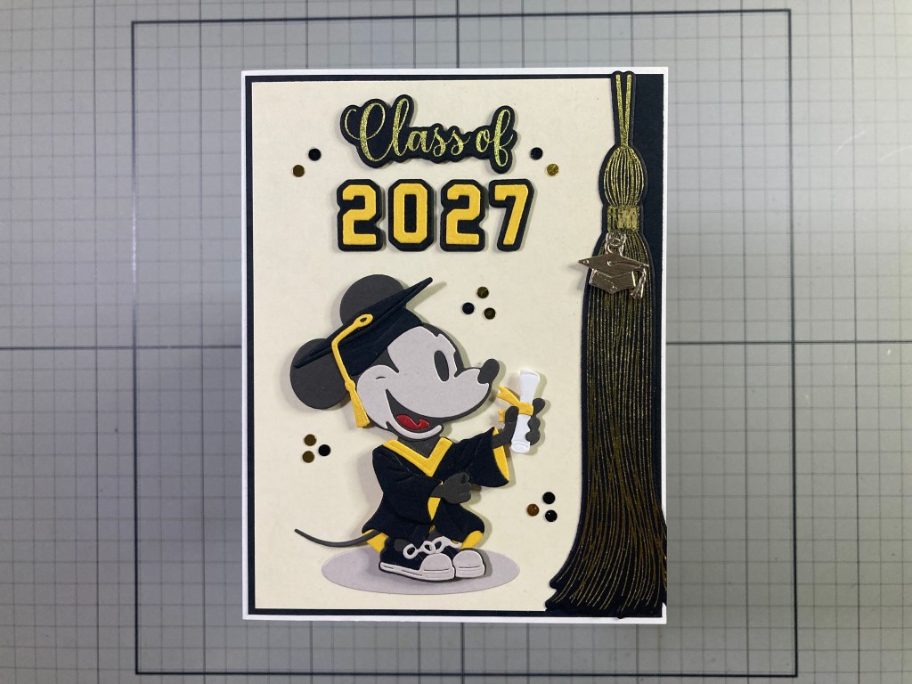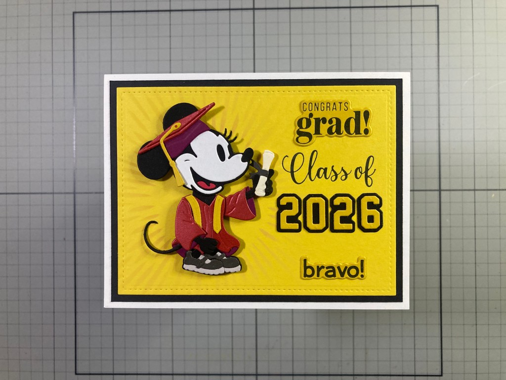 I stenciled the sunburst (lightly) behind our mouse with the Sun Stencil from the MMH February 2024 Premium Kit and Fossilized Amber Distress oxide ink. That gives a little highlight to our graduate! I die-cut the background panel to 5″ x 3.75″ with a Lawn Fawn Stitched Rectangle die and added a (5.25″ x 4″) black mat and glued those to an A2 White card base. I glued the die cut sentiments flat (over their pressed sentiments) and glued the year in place.