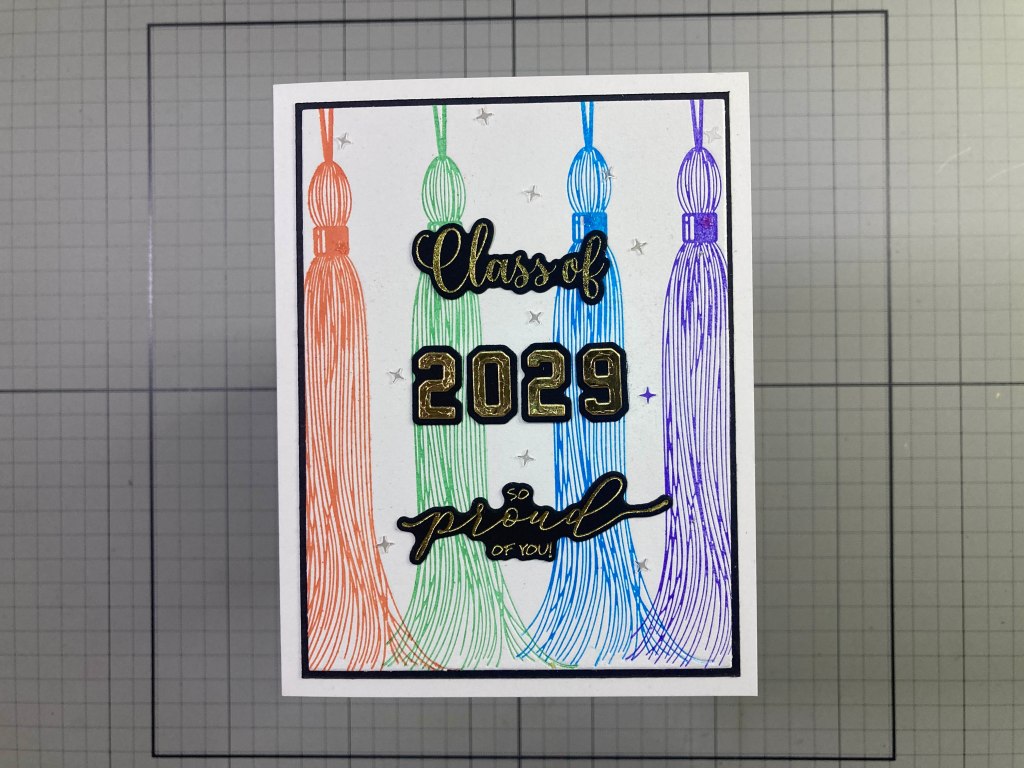 The sentiments are Glimmer foiled with Gold on Pitch Black card stock and die-cut with their matching dies. The year is die-cut from Pitch Black and Gold Metallic card stocks and glued together. The sentiments and date are glued flat to the card front and I added an assortment of clear star glitter pieces for some graduation sparkle! I actually intended this to be a 2026 graduation card, but I guess I was too focused on getting the date glued down straight and square, and forgot to pay attention to whether the numbers were right side up or upside down! Hopefully, one of my nieces or nephews will be graduating in 2029!?! HA!