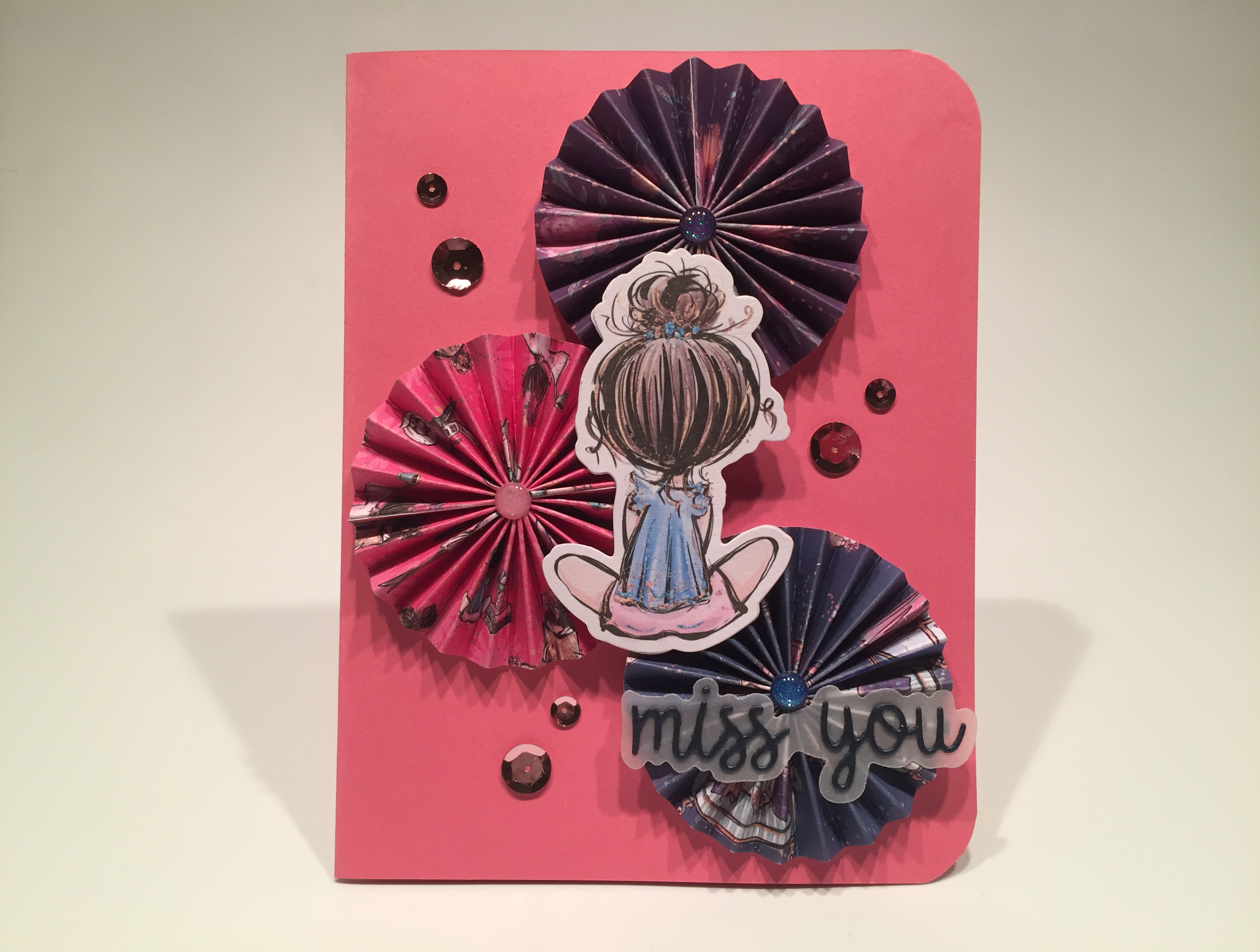 I glued the rosettes directly to the Pink card base, and added the glitter enamel dots to their centers. We don’t have pink enamel dots in this kit but we did get some in the September 2019 kit! This sentiment is one of our die-cuts included in this kit and I die-cut the words from the Dark Blue Pearlescent card stock (from the Safe and Sound Pearlescent Card Stock bundle add-on) and cut the shadow from some plain vellum. I glued those together and then down to the bottom rosette. I glued two of the sitting Eyelash Girl ephemera pieces together for a little extra rigidity and glued those on top of the rosettes. I added some pink sequins from our sequin mix to the card front and rounded the right corners with my Corner Chompers. I LOVE those rosettes and I think they help make this a particularly stunning card! Even in pink!