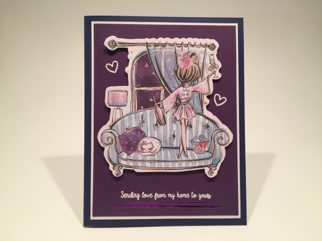I found some purple card stock in my stash that matched the purple sky in this window almost perfectly! I die cut that with a LFSRD, and matted that on a thin white mat and then down to the other Navy Blue card base. I stamped the sentiment (again from the “Can’t wait to see you” stamp set) and the hearts (from the kit stamp set) on the background using VersaMark ink and embossed them all in white. I added the ephemera piece with foam tape and added some Purple Mirror Pin-Stripe peel offs (from the Safe and Sound Pin Stripe peel off pack) under the sentiment for a touch of shine.