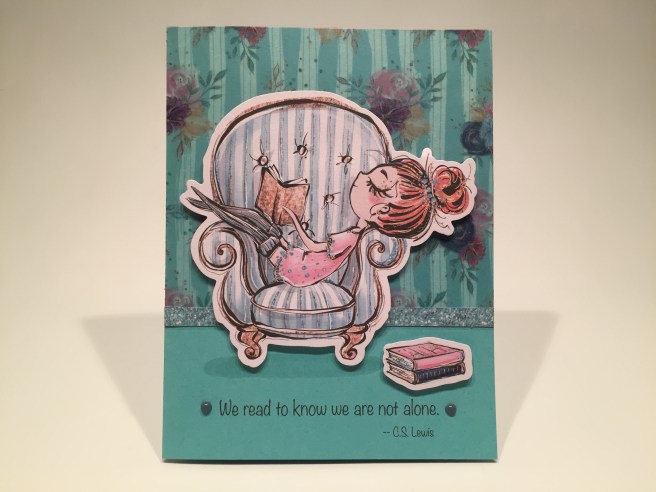This is a great quote from C.S Lewis that promotes reading, but also speaks a little bit to our current circumstances. Kind of a middle ground here! Using my piggy-back printing method, I printed this sentiment directly on my other Teal Blue card base using the Noteworthy font again. I cut a piece of our printed vellum to 3.75″ x 4.25″, ran it through my Zyron sticker maker and glued it to the top of the card front. I trimmed out a strip of the faux blue glitter from the striped pattern paper and glued it to the bottom of the vellum as a baseboard. I mounted both ephemera pieces with some foam tape and added a touch of a shadow under both with a light grey alcohol marker. A couple of Nuvo drops to highlight the sentiment and we have another terrific card for any avid reader!