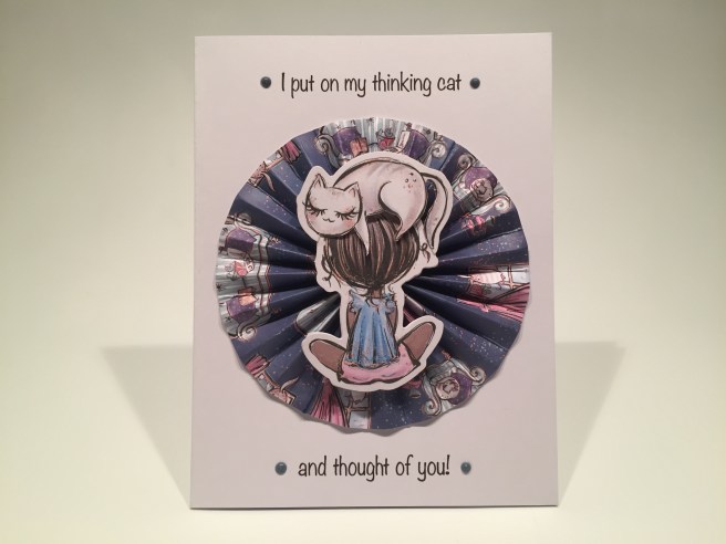 I fussy cut the white border away from the bottom of the cat ephemera piece and positioned her on top of the Eyelash Girl’s head so the white border would continue around the outside of both pieces. Some strategically placed foam tape and glue attached the “thinking cat” to her head. I glued the rosette to the card front and the thinking cat girl on top of the rosette. A few Nuvo drops highlight the sentiment, and HOORAY! We have a pun!!! I had to dig pretty deep for this great groaner of a pun, but I like it a lot! I’m sure cat fanciers would get a big kick out of this card!