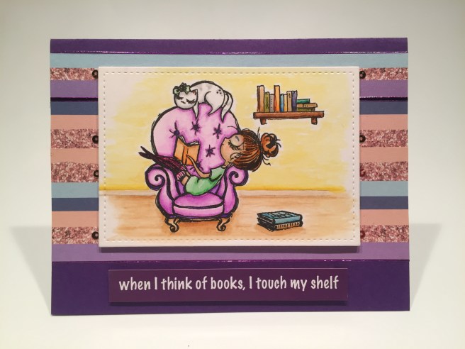 This one makes me laugh out loud! The easy chair and books are from the “Can’t wait to see you” add-on stamp set stamped with Onyx black ink on Bristol Smooth card stock and colored with my Zig Clean Color Real Brush Markers. I sketched in the little bookshelf using Pigma Micron pens and tried to stay true to the spirit of the original stamp illustrations. I think it looks like it belongs! Once the whole scene was colored. I die-cut it with a 4″ x 2.75″ LFSRD.