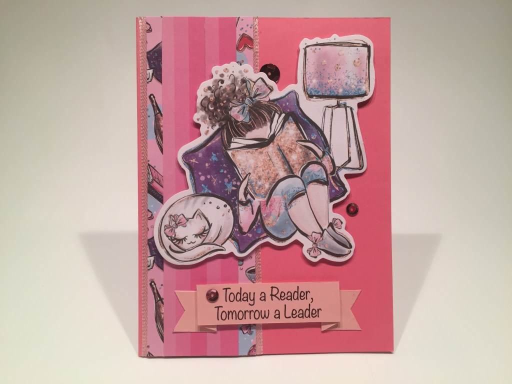I mounted this big ephemera piece using foam tape and turned to my Silhouette Software to print this encouraging sentiment. I printed this on a scrap of pink card stock (YES… I have SOME pink card stock in my stash!) using the Noteworthy font, and cut it down to a foldable banner shape. I mounted the banner with foam tape behind the center and glued the ends down to the card base. A few sequins from our sequin mix and some sparkle pen on the two bows adds a respectable amount of glitter and shine. A perfect gift card to accompany the gift of a book for your favorite young bibliophile!