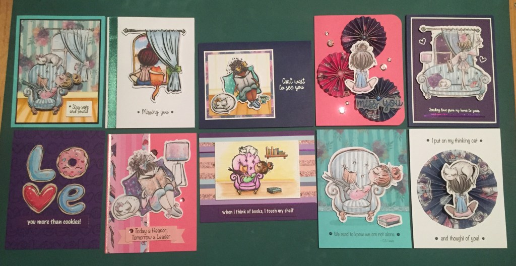 What started out a little bit depressing, became much more fun as I worked my way through these 10 cards! I might have dropped into a depression coma if all of my cards were about staying safe and how much I miss you!! This is a nice assortment including some encouragement cards, a valentine and thinking of you cards and some cards for the bibliophile in all of us! Let me know which card(s) are your favorites!
