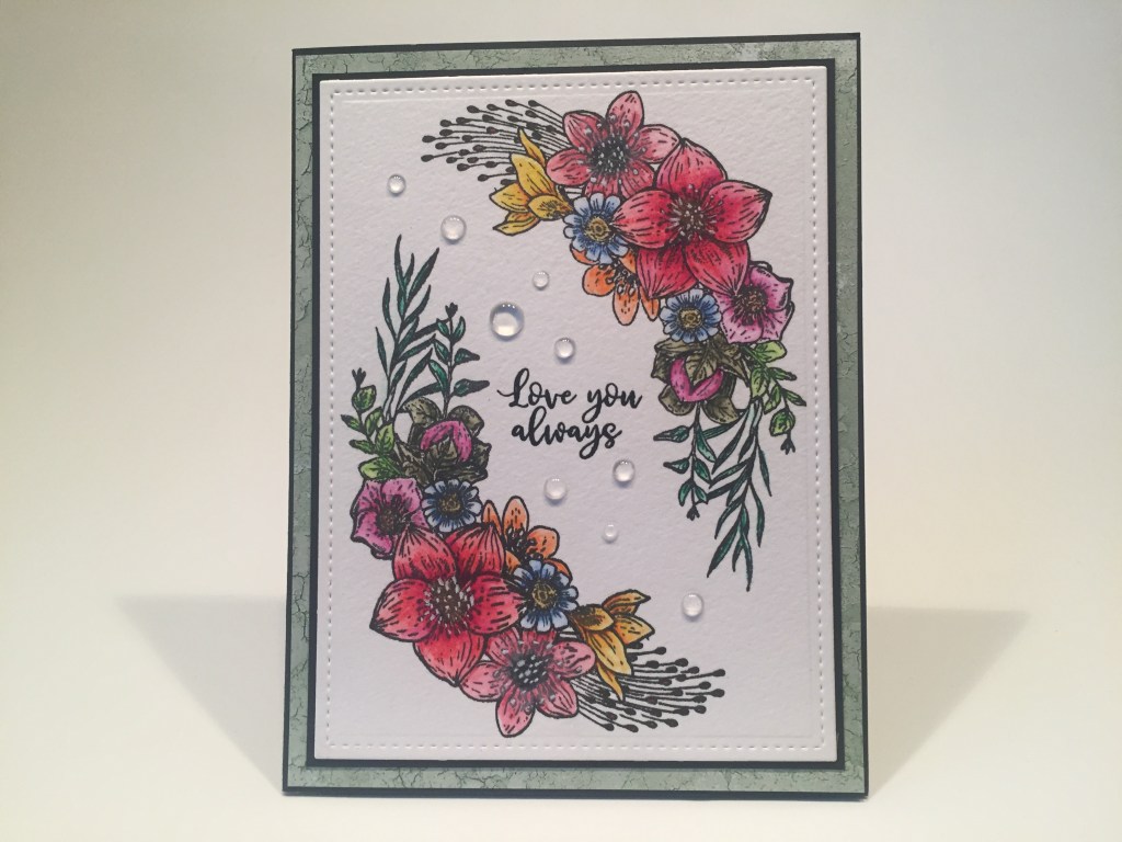 I stamped the sentiment from the “Love You Always” stamp set in VersaFine Onyx black ink, and embossed that with some clear embossing powder. I die-cut the watercolor paper with a Lawn Fawn Stitched Rectangle Die, glued that to a thin black mat, then to a thicker green “cracked paint” pattern paper mat and then down to the back card base. I added some Nuvo Morning Dew Crystal Drops from our kit for a sprinkling of shine and a touch of dimension. I really need to remind myself to use these watercolor pencils more often! They work so well and I truly love the watercoloring on this card!