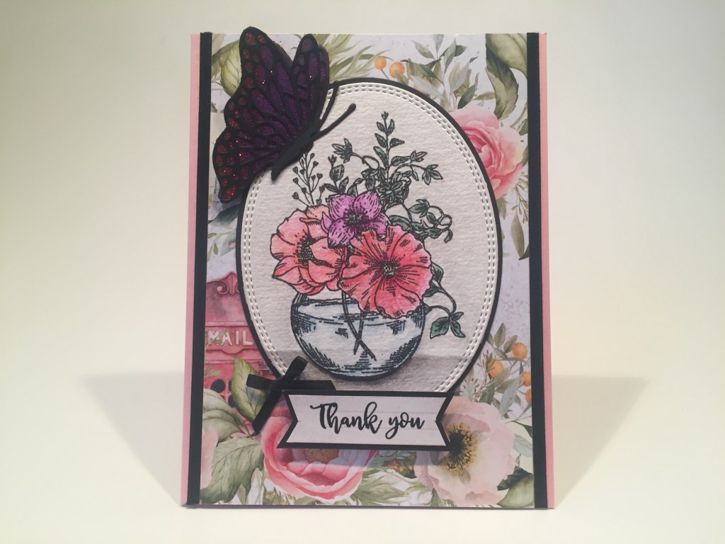 I cut a background (5.5″ x 3.75″) for this card using the large flower garland cut-apart sheet, glued that down to the Blush Pink card base, and glued some of our black ribbon along the edges. I glued my matted art directly to the card front, stamped and embossed the sentiment on a piece of pattern paper, cut that into a banner, added a black mat, and attached the sentiment using foam tape. I cut the Butterfly die from our embellishment bag twice from some HA Pitch Black card stock, attached some Scor-tape behind the wings, and glittered the open spaces with red and purple super fine glitter. It doesn’t read very well in this picture, but it’s beautifully sparkly in real life! I glued the two butterfly bodies together, added a touch of foam tape between the wings, and glued that assemblage to the card front. One of our black bows provides a final touch of class for the sentiment. I really like that round glass vase and think this Thank You card is the perfect embodiment of this kit!
