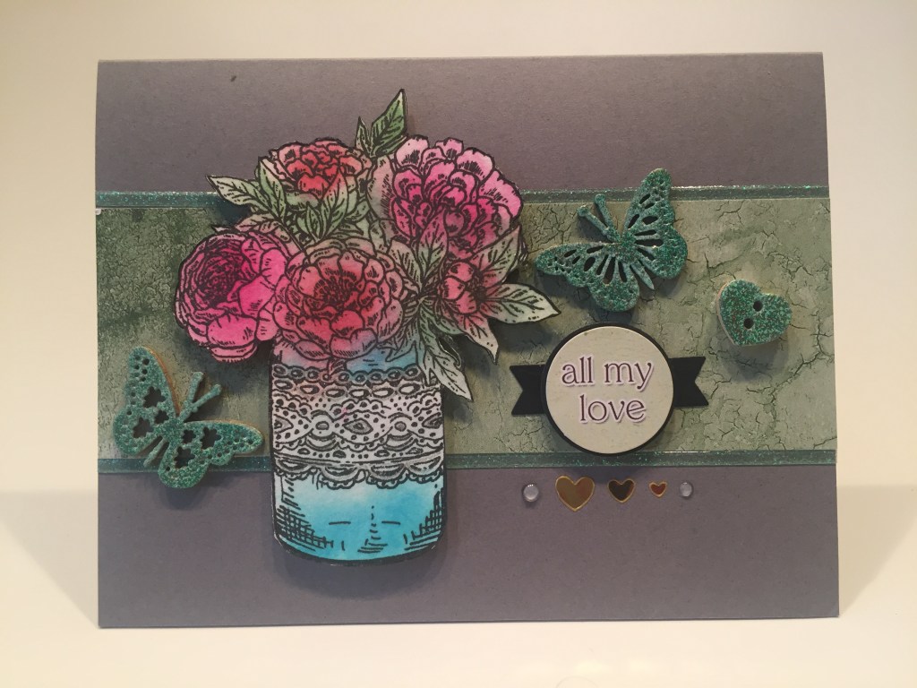 I embossed the tops of the two wood-veneer butterflies and one of the wooden buttons from our embellishment bag using VersaMark ink and the LFL Atlantis Green embossing powder. The sentiment is from the Circles and Sentiments add-on sticker pack, matted on a thin black mat and foam taped over a small black banner to the right of the bouquet. I glued the embossed die cuts to the card front and added two spots of our Nuvo Drops and three Mini Heart peel offs (from the Variety Bundle add-on) under the sentiment. Nice touch of bling and those hearts reflect the gold accents in that embossing powder. I did add some glitter to the lace wrapping on the jar with my Stardust Gelly Roll pen for a little extra sparkle. I think this is a very effective short-cut for watercoloring an image, and really like the final effect of this card!