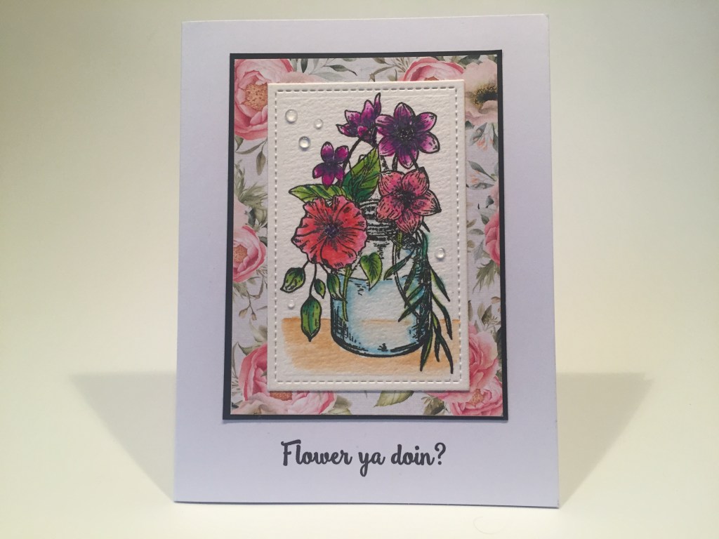 I printed this pun-ny sentiment directly on the white card base using my Silhouette Software, the Smoothie Shoppe Font and my Piggy-back printing method. Makes me giggle! I glued the framed assembly directly to the printed card base. This is more vibrant that the DS watercolors, approaching the tones of the watercolor pencils, but I was able to get some better color mixing with the pencils… almost tit for tat, but I especially love the water in this vase!