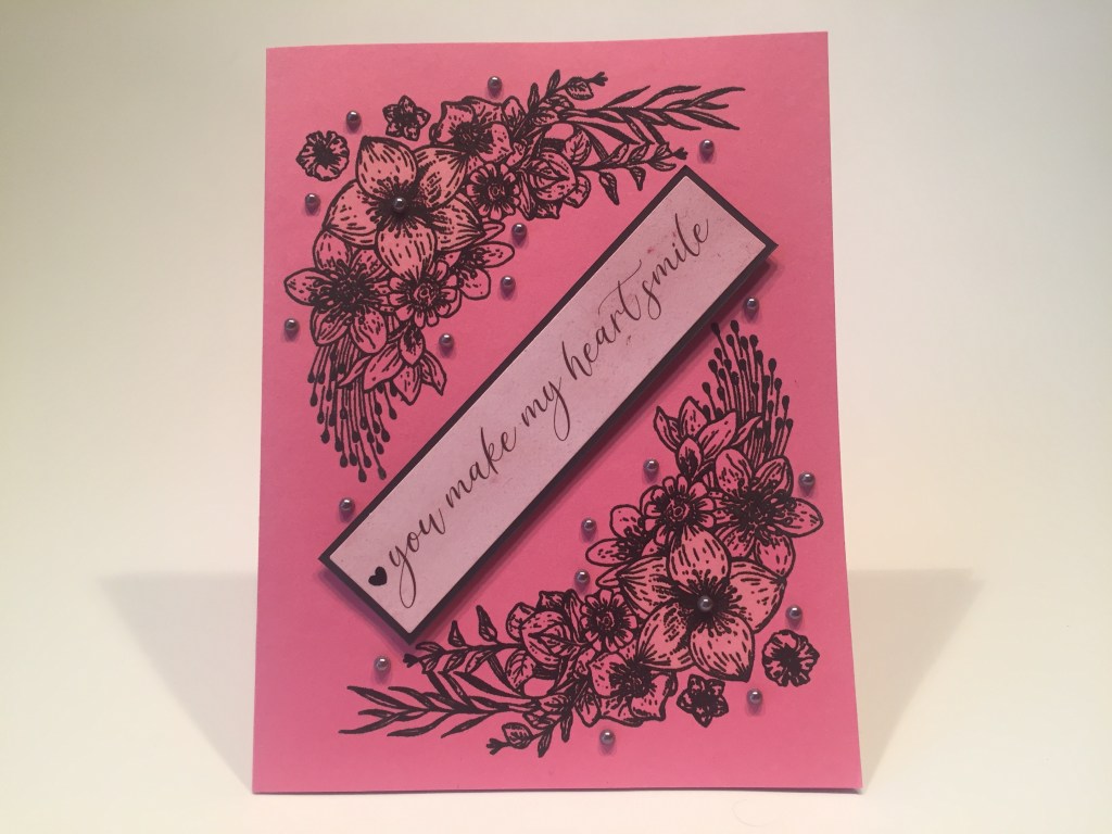 Here’s some hard-core pink for you! I turned to the floral spray stamp again, and stamped that directly on the Warm Pink card base with VersaFine ink, and embossed that with clear embossing powder. I also added the two small flower stamps to the corners of the sprays as well. I wanted a tiny bit of variety to the flowers, so I painted a little bleach on the center blossoms to lighten them up a touch… subtle, but recognizable, I think that added just the right touch to this arrangement. The sentiment is from our sticker sheet, matted on black and added to the card front with foam tape. A bunch of small metallic embellishments (can’t figure out which LFL kit these came from) and a black Mini Heart peel off on the sentiment itself add a final shiny touch to this very pink card! I really like the black and pink – very sharp and ultimately fairly simple!