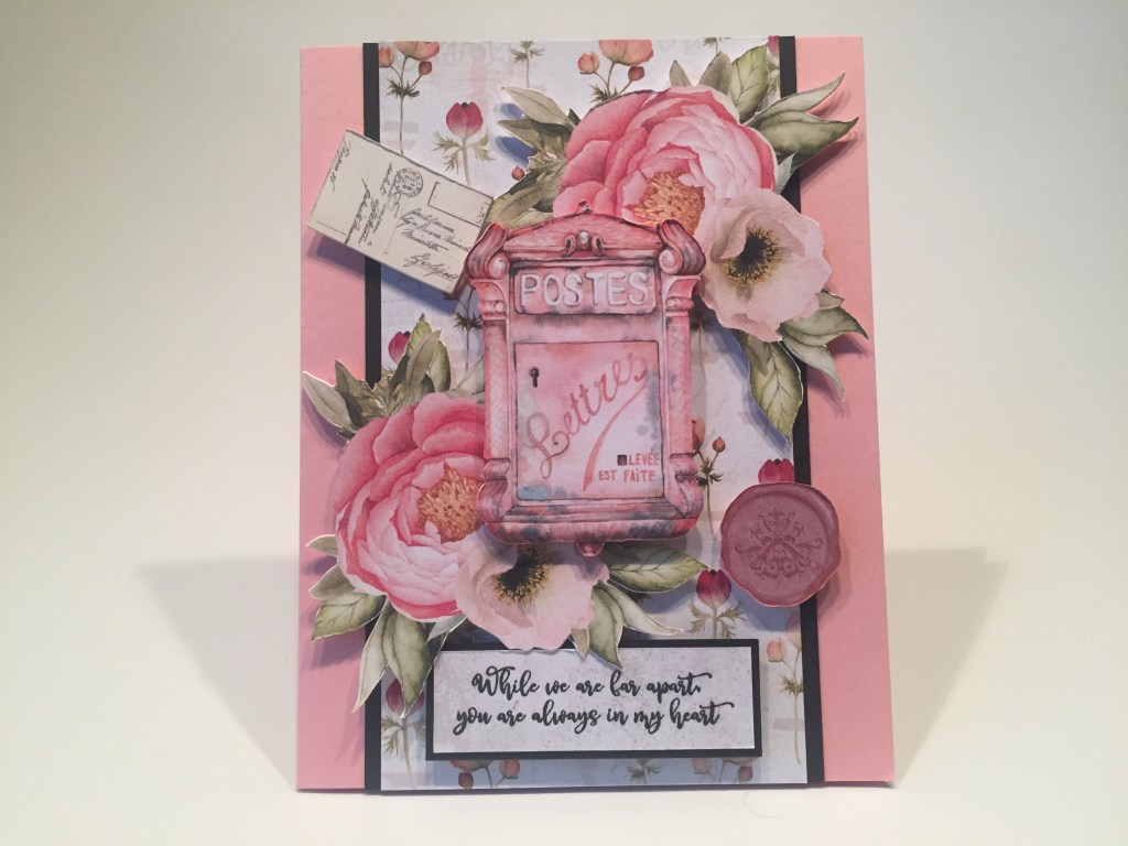 I cut a piece of the ‘taped single-blooms’ pattern paper to 5.5″ x 3″ and matted that on a piece of 5.5″ x 3.25″ black card stock and glued those to the Blush Pink card base. The flowers, letter box, postcard and wax seal were all fussy-cut from the large cut-apart sheet. I ignored the fine foliage around the blooms and just cut out the larger leaves. These are all attached to the card base with foam tape (double thick for the letter box). I stamped the sentiment (from the add-on stamp set) on a piece of pattern paper, trimmed that down and added a black mat, and foam taped that to the card front. I think these kind of cards are a perfect use for all the images in this kit. You’re going to have to do some fussy cutting, but I think the end result is certainly worth it! No sparkles or bling on this card – I don’t think any are needed… and seem to detract from the vintage feel.