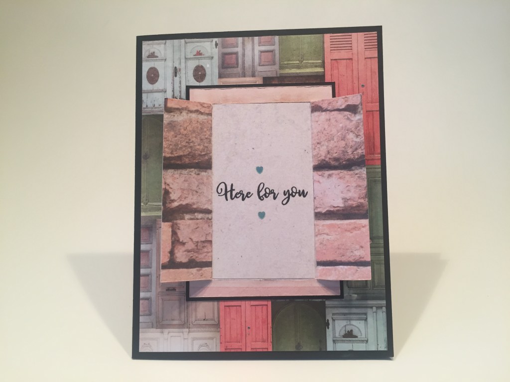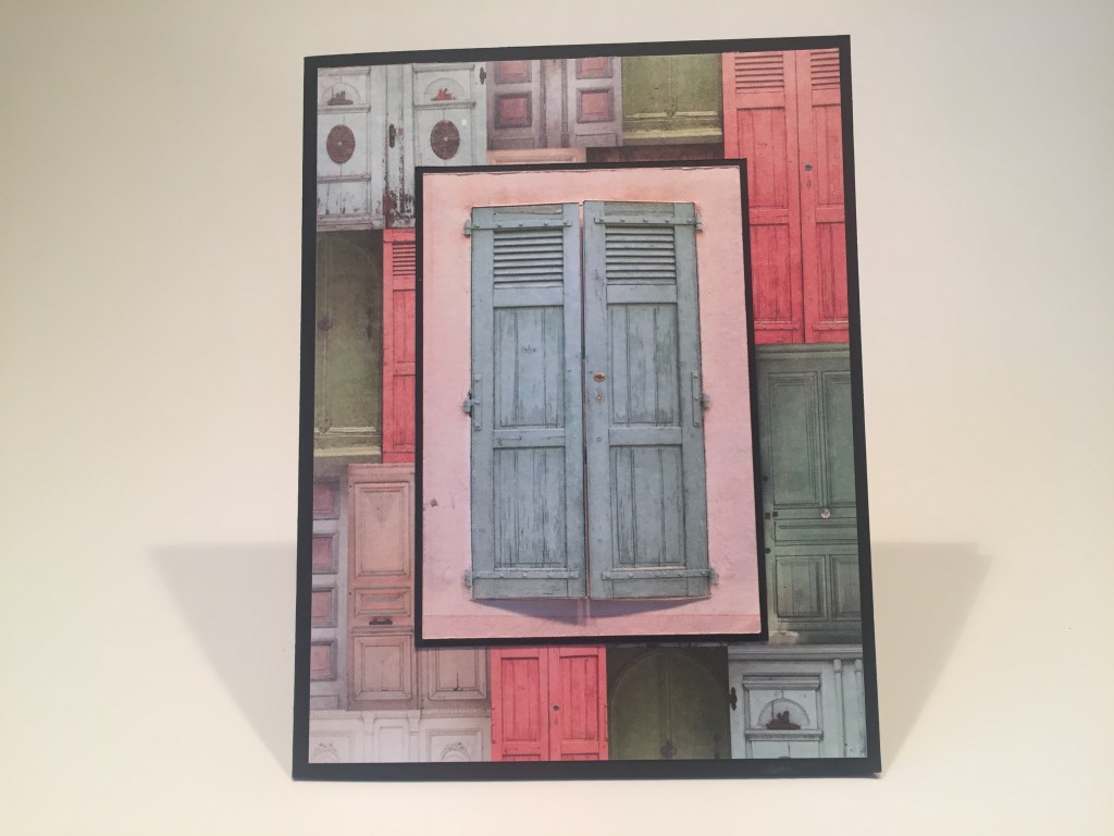 I cut one of the ‘shutter and doors’ pattern papers to 4″ x 5.25″ and glued that to the Black card base. I trimmed the single shutter cut apart piece down to 2.5″ x 3.5″, cut the shutters open (top, bottom and center) and scored the ‘hinges’ so the doors would open. I added a piece of the simple distressed beige pattern paper behind the opening, added a thin black mat behind that, and glued those to the center of the card front.