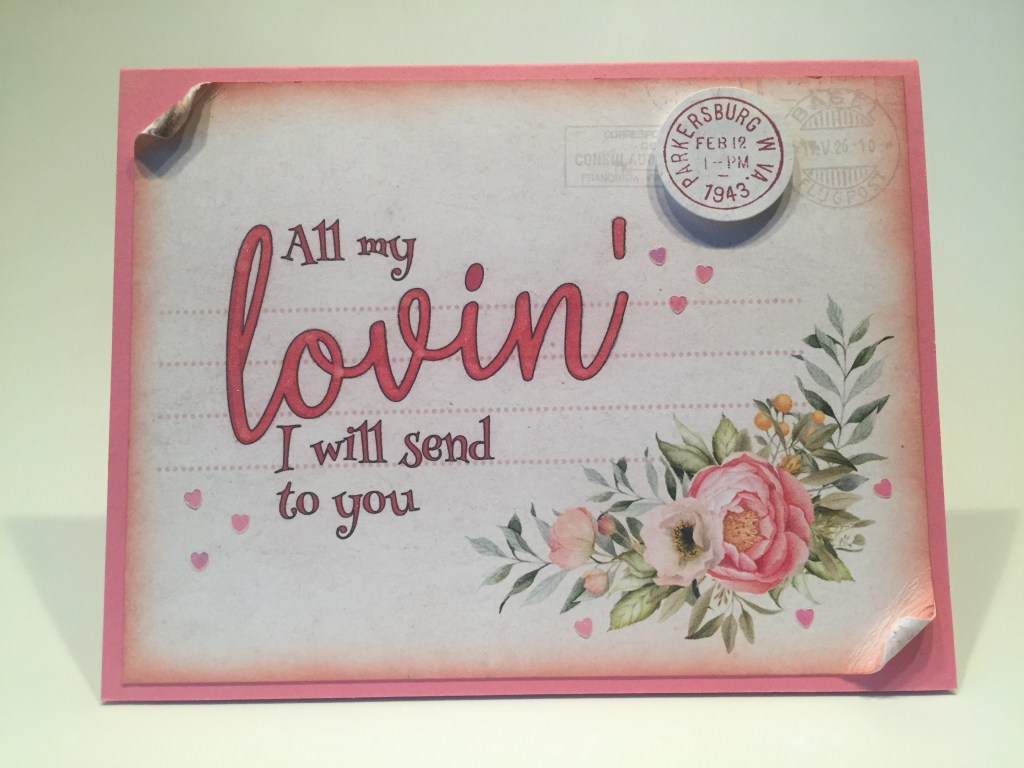 I trimmed that ‘envelope’ cut apart panel down to 5″ x 4.25″. I printed this sentiment directly on the cut apart panel using my Silhouette Software, the Henny Penny font and the Dream State font. I did use a light board to make sure that I was able to achieve proper alignment of the printing with the pattern paper. I ink blended the edges of that panel with some Fired Brick Distress Oxide ink, curled up the opposite edges and glued that to the Warm Pink card base. I added one of the postmark stickers from the Circles and Sentiments add-on sticker pack – removing the sticky with some powder and using foam tape to mount it. Little pink heart glitter pieces add some nice bling, and I did use my Spectrum Noir Sparkle pen to add some glitter to the large lovin’. Not only is this a great Beatles lyric, but I think it works especially well with this pseudo envelope panel!