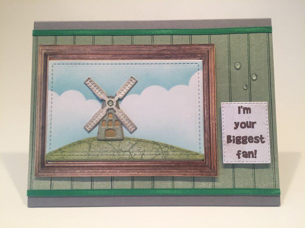 I cut the small bead-board pattern paper to 5.5″ x 3.5″ and glued that to my last Dark Grey card base, and added some of our green ribbon to the top and bottom edges. I printed this sentiment on more pattern paper using the Brady Bunch Remastered font, and die-cut that out using the square die in the Background Builder Die Set 1 from the September 2019 LFL release. I mounted the framed background and sentiment with foam tape and glued the windmill to the top of the hill. A few Nuvo Drops – including one in the center of the blades – adds a little shine to this fun card. I love pairing the “biggest fan” sentiment with this tiny windmill! Makes me laugh! And, hey! We don’t need no stinking’ tulips!!