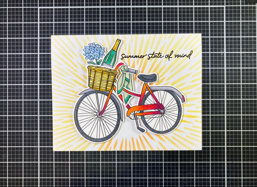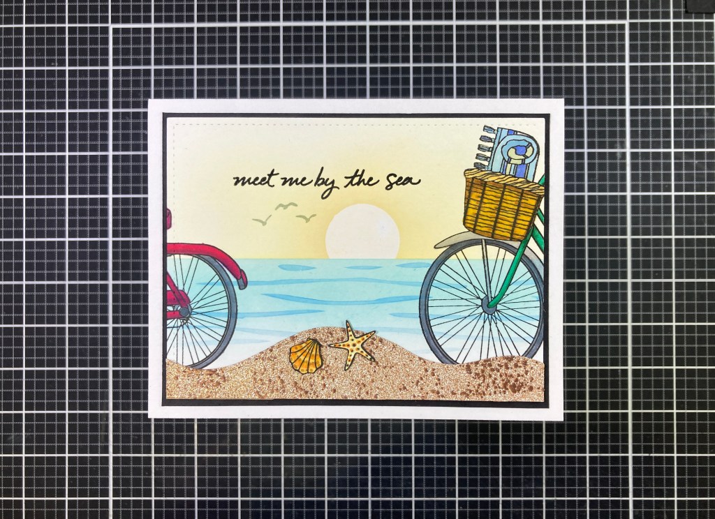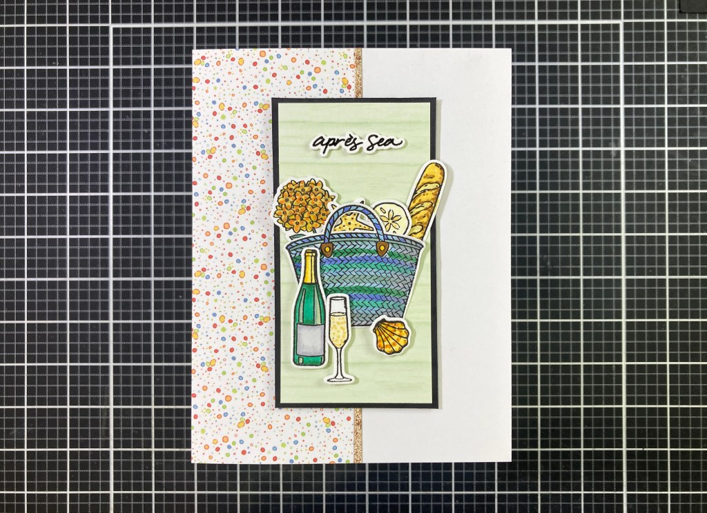 As a final touch on this vignette, I stamped the steam rising from the pot using SSS Barely Beige ink. I die-cut the panel to 3+1/8″ x 4″ with a Lawn Fawn Stitched Rectangle die and added a thin black mat behind. The background is from the Bo Bunny pattern paper cut to 4″ x 5.5″ and glued to the center of an A2 White card base. I added some Love From Lizi Pin Stripe Peel-Offs in Brown Mirror on the two sides of the pattern paper for a touch of shine.