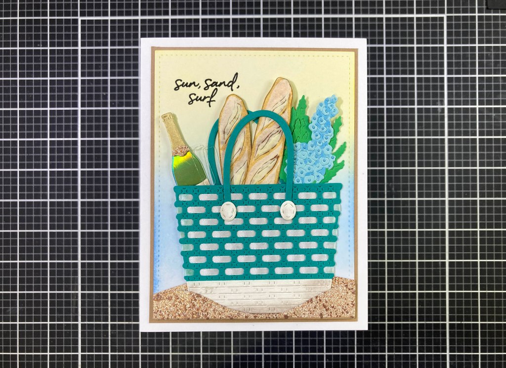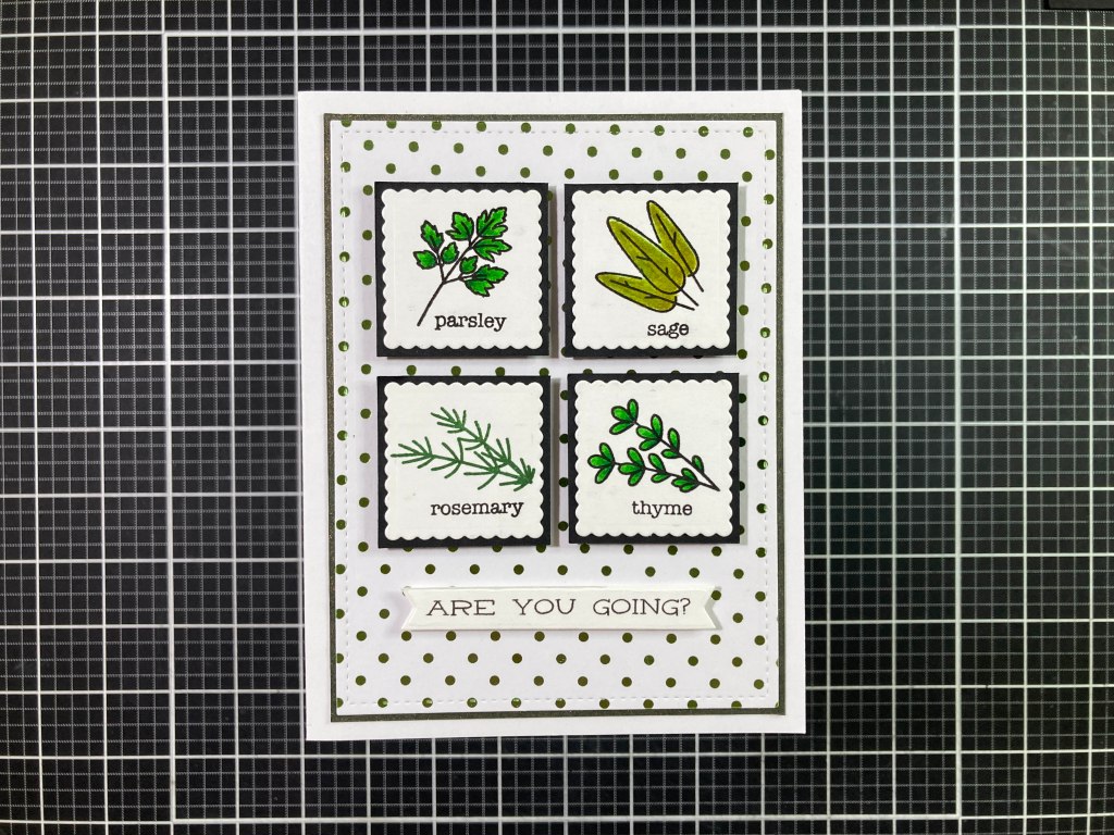 This is exactly what I had in mind! I die-cut the Postage Collage Die from some 110# Neenah Classic Crest Solar White card stock and then arranged the stamps. Since I already had a green pepper mask, I went ahead and added that in front of the pepper grinder. I stamped all the food items with VersaFine Onyx Black ink, and stamped the solid soup stamp with Antique Linen and Vintage Photo Distress Oxide inks. I created this pun-y sentiment using my Silhouette Software and the Take Charge font. I printed that right in place using my piggy-back printing method and my NEW! Epson EcoTank printer.