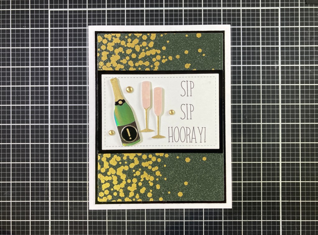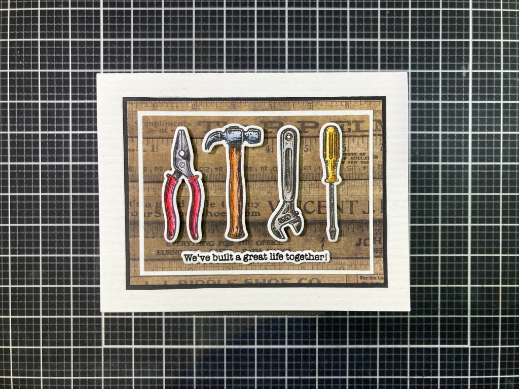 I glued the matted vignette to the center of the pattern paper, and stamped the sentiment on a scrap of Bristol card stock with Hero Hues Root Beer Reactive ink and embossed that with some clear embossing powder. I die-cut the sentiment (and two blanks) with the matching die, stacked and glued the three layers together, and added them to the card front. The shine on the sentiment matches the peel-offs and the tile background feels extra homey… and a perfectly good pun!