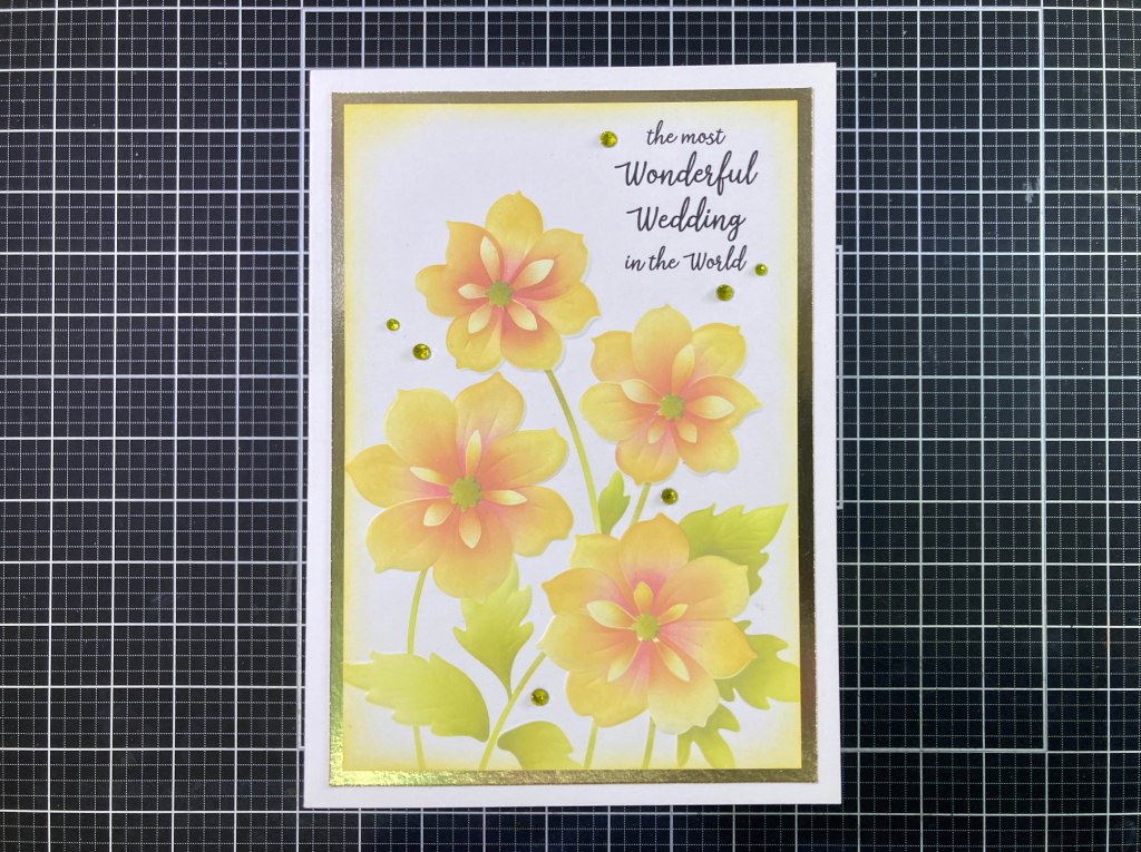 Again… since I already had the masks, I masked off the pot and stamped the background using the Concord & 9th Sunshine Turnabout Stamp set (and, yes, I use the C&9th turnabout jig as well). That is one of my favorite and most used turnabout stamps in my stash! I stamped that with Fossilized Amber, Peeled Paint, Candy Apple, and Spiced Marmalade Distress Oxide inks. Love it!