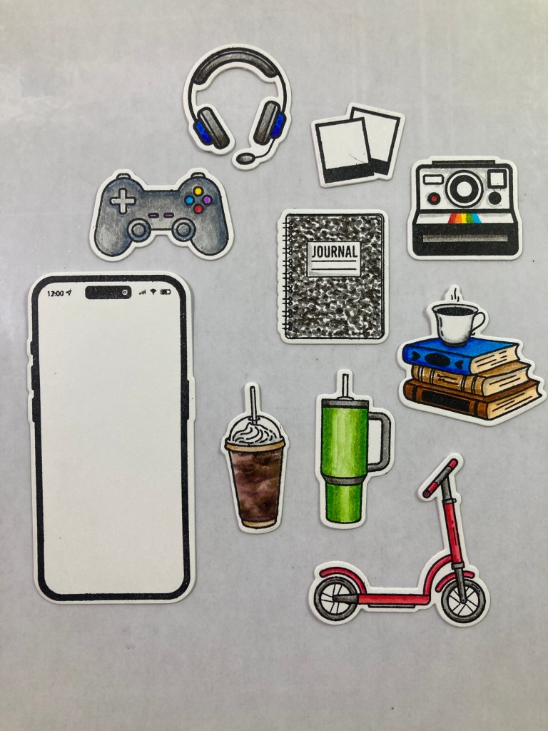 I die-cut the two hand dies from plain Ivory card stock and colored the hands with my go-to R18, R19, and R20 Ohuhu markers. I die-cut the two Striped sleeves from some plain Gray card stock and the stripes from some darker Gray. I glued the stripes to the sleeve and suddenly had what appeared to be prison garb… so I grabbed an R180 Ohuhu marker and colored over the Gray. That’s better! I masked off the arms and ink Blended Hero Hues Lemon Drop, Creamsicle, Grape Slush, Thistle, Splash and Blue Hawaii Reactive inks for the background (half on one die cut, half on the other).