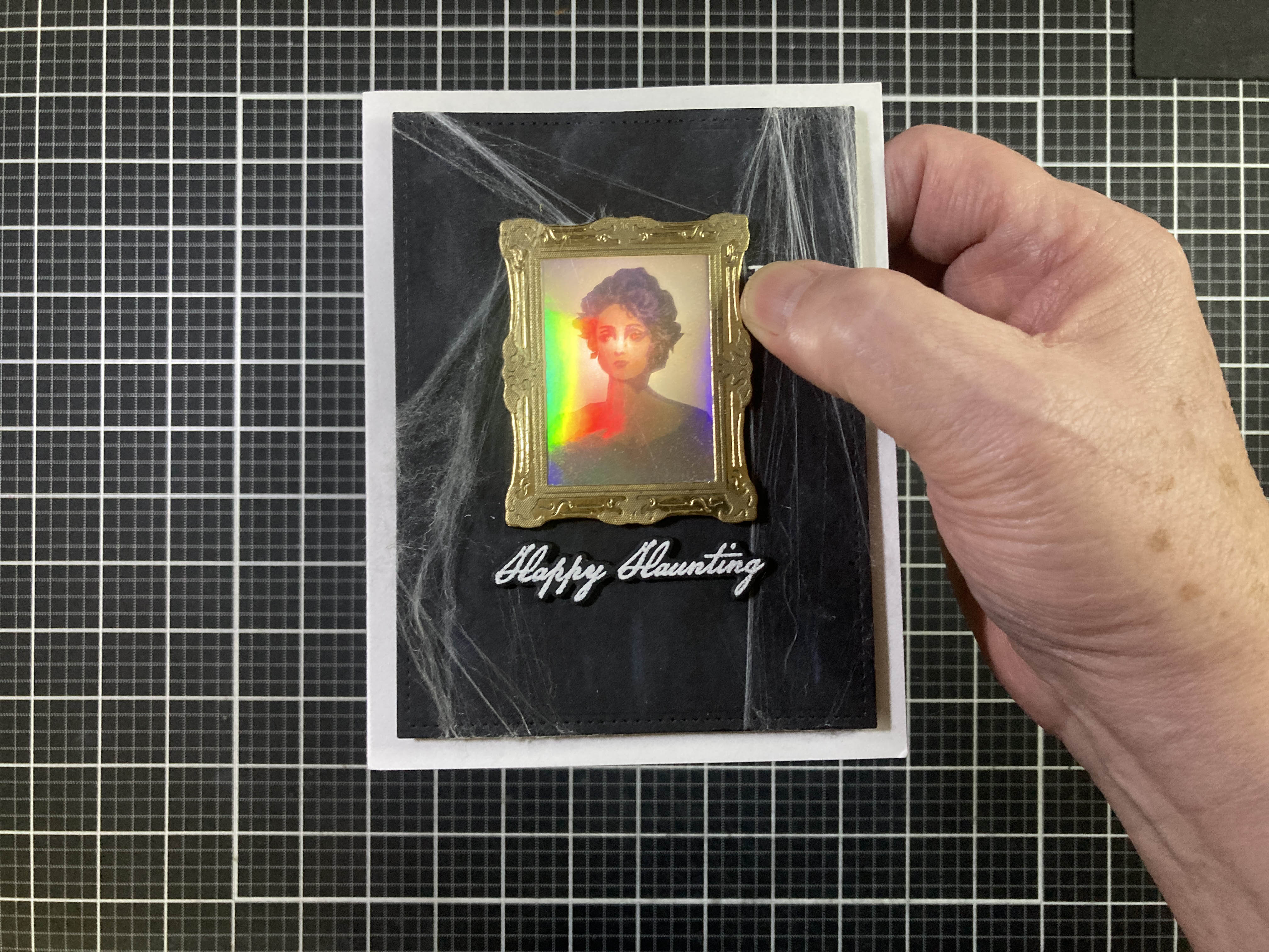 I trimmed the panel to 3.75″ x 5″ and glued a thin Black mat behind. Using a T-square and the pot lid I marked where the tab on the lid fell, and cut a slit in the base for the tab to pass through. Now the secret to making this a pull-tab card is to NOT score the tab at the edge of the pot lid, but to score it about a quarter of an inch above the lid. Now slide the lid tab through the slot and affix a “spacer” (wider than the tab but just under a quarter inch) to the tab in order to hold the lid in place. Then, when you fold the tab over, and attach a pull-tab (1/2″ wide/double thick), the lid will flip up when the pull tab is pulled. If you find that description confusing, I will demonstrate this on my video that accompanies this blog.