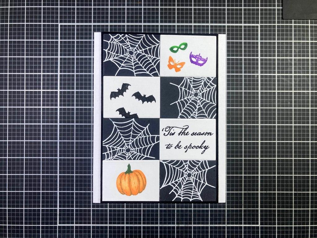 Since I had the masks, I decided to cover the pot and lid with the masks and use an old Carta Bella Designer Diamond background stamp with Antique Linen Distress Oxide ink to stamp the background right over the masks. I stamped the background a second time using Vintage Photo Distress Oxide ink around the edges. While the masks were still on, I blended a little Antique Linen ink around the bottom and sides of the pot, with a light touch around the edges and all over the background, and I also stamped the steam coming out of the pot with SSS Barely Beige ink. Then I die-cut the panel to 3.75″ x 5″ with a LFSRdie and added a thin Black mat before gluing them down to an A2 White card base.