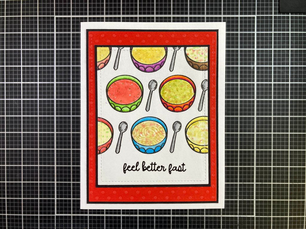 More soup, of course! Using my MISTI, I stamped the bowls and spoons on a panel of Neenah Classic Crest Solar White 80# card stock with VersaFine Onyx Black ink. I colored the bowls and spoons with my Ohuhu Alcohol markers and used a variety of Distress oxide ink pads with a brush and water for the soups. I stamped the “noodles” in the bottom center bowl with Antique Linen Distress oxide ink and embossed that with clear embossing powder. Short of covering the entire contents of the bowls with Glossy Accents, I think adding some shine to the “noodles” does the trick and adds the right amount of shine to your soup.