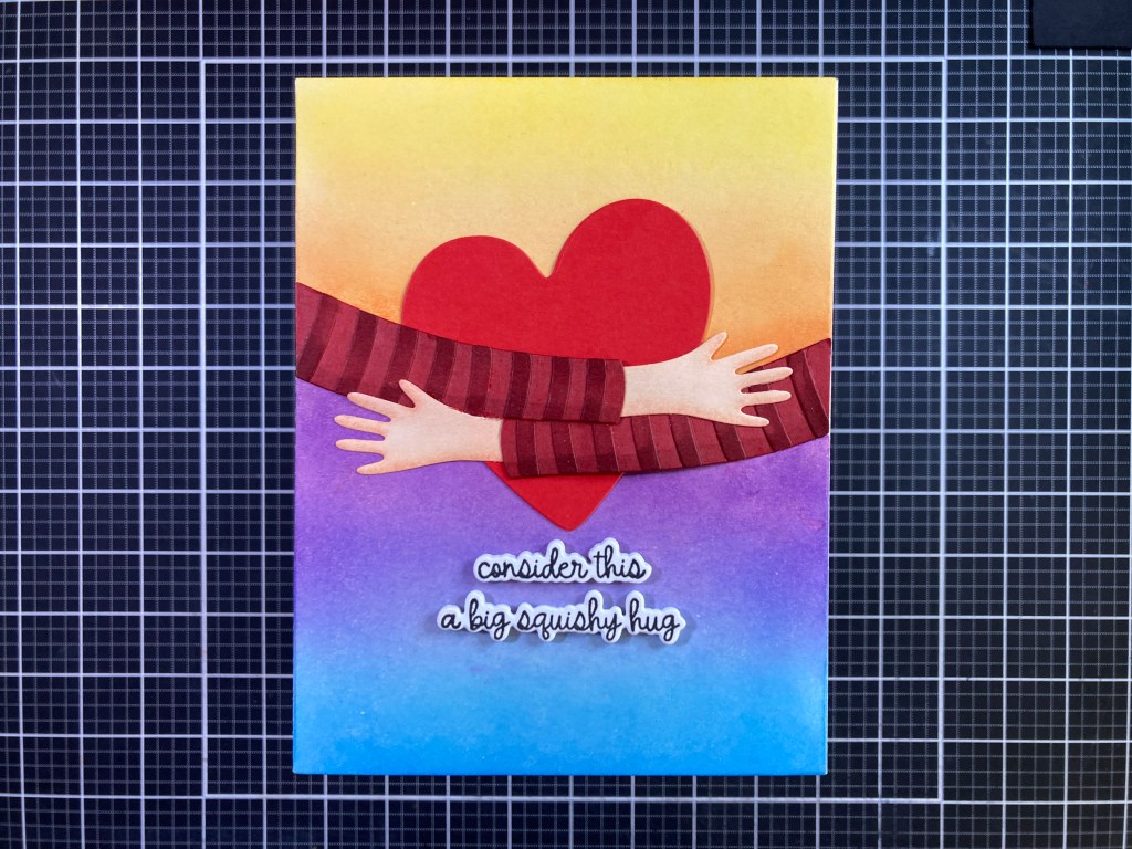 I glued the sleeves to the arms trying to keep away from the bottom of the right arm and the top of the left arm to avoid buckling where the arms overlap. No matter how hard I tried I still had a bit of conflict where the arms touched. I don’t think the overlap is bad… you just need to be aware of it. I glued the two die cuts (only the left and right edges of the arms) to an A2 White card base. I slid the heart (die-cut from the Poppy card stock) behind the arms and glued it in place. Then I glued the hands down and tried to ignore the tiny buckle where the arms overlap.