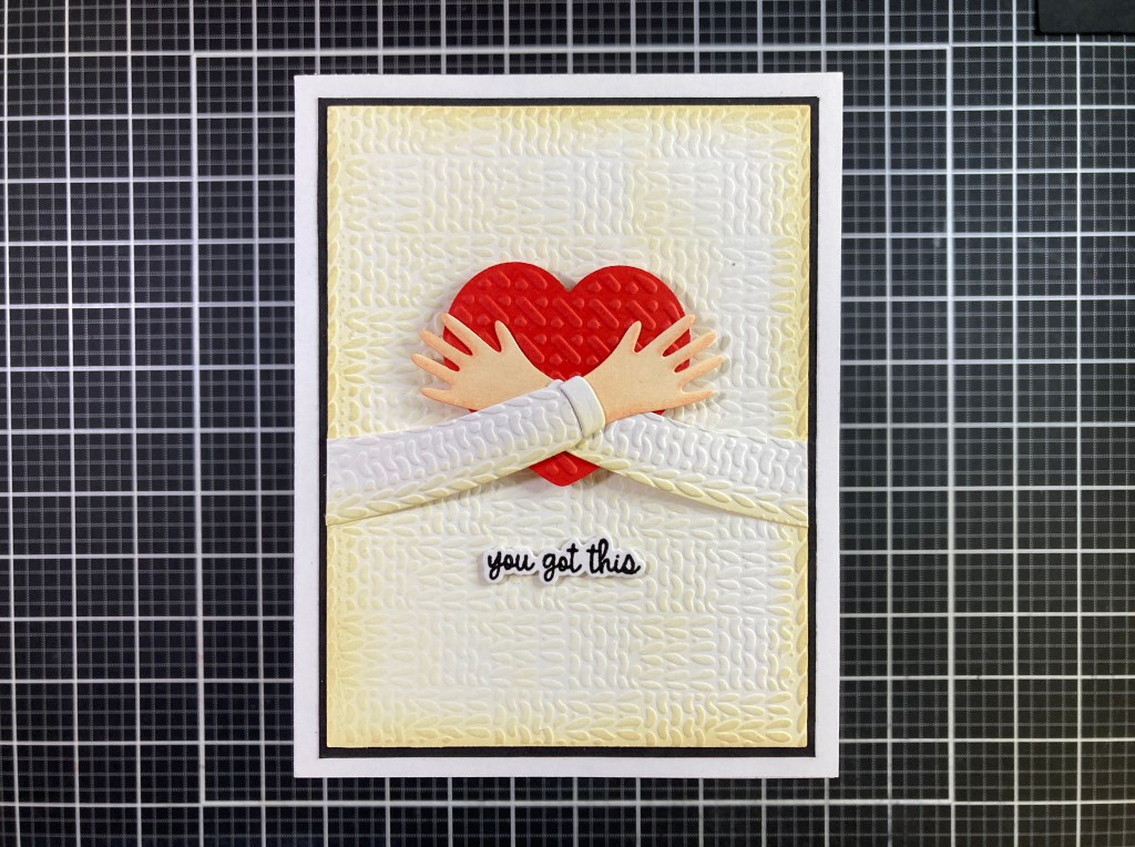 I used an old Sizzix Heart, Cross Stitch emboss and cut folder to cut out this heart from Poppy card stock. I thought the texture would be nice along with the sweater texture. I attached that to the center of the card front using thick foam tape. I decided where to place the arms, and trimmed off the excess before gluing them to the left and right edges of the card front and then to the top of the heart. No need to fuss with overlaps or buckling… and an extra pair of arms is always useful!