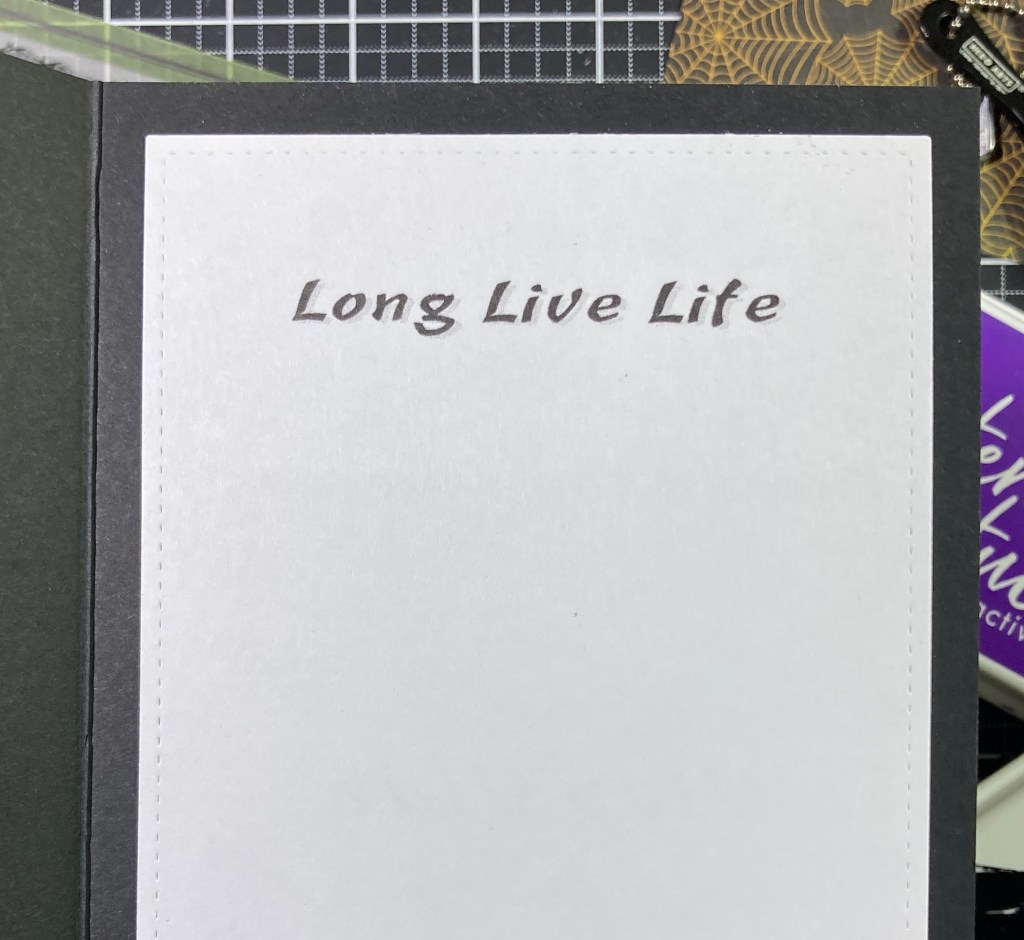 Of course, I began with the big terrarium stamp – LOTS of details on this stamp, but if you take it plant by plant, it’s fairly easy to differentiate all the flora from each other! On the front of an A2 White card base, I die-cut the domed opening and lightly blended HA Splash Reactive ink around the sides and top. I die-cut the colored stamp and glued it in place on an A2 panel of White card stock. I stamped the sentiment with VersaFine ink and embossed it with Clear Embossing powder. Then I glued one of the clear acetate panels on top and glued those to the back of the die cut card base centering the stamp in the arched opening. (I did trim the panel to fit.)