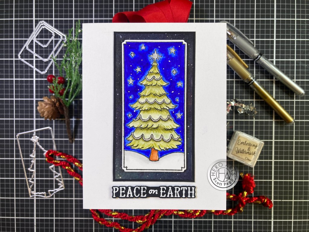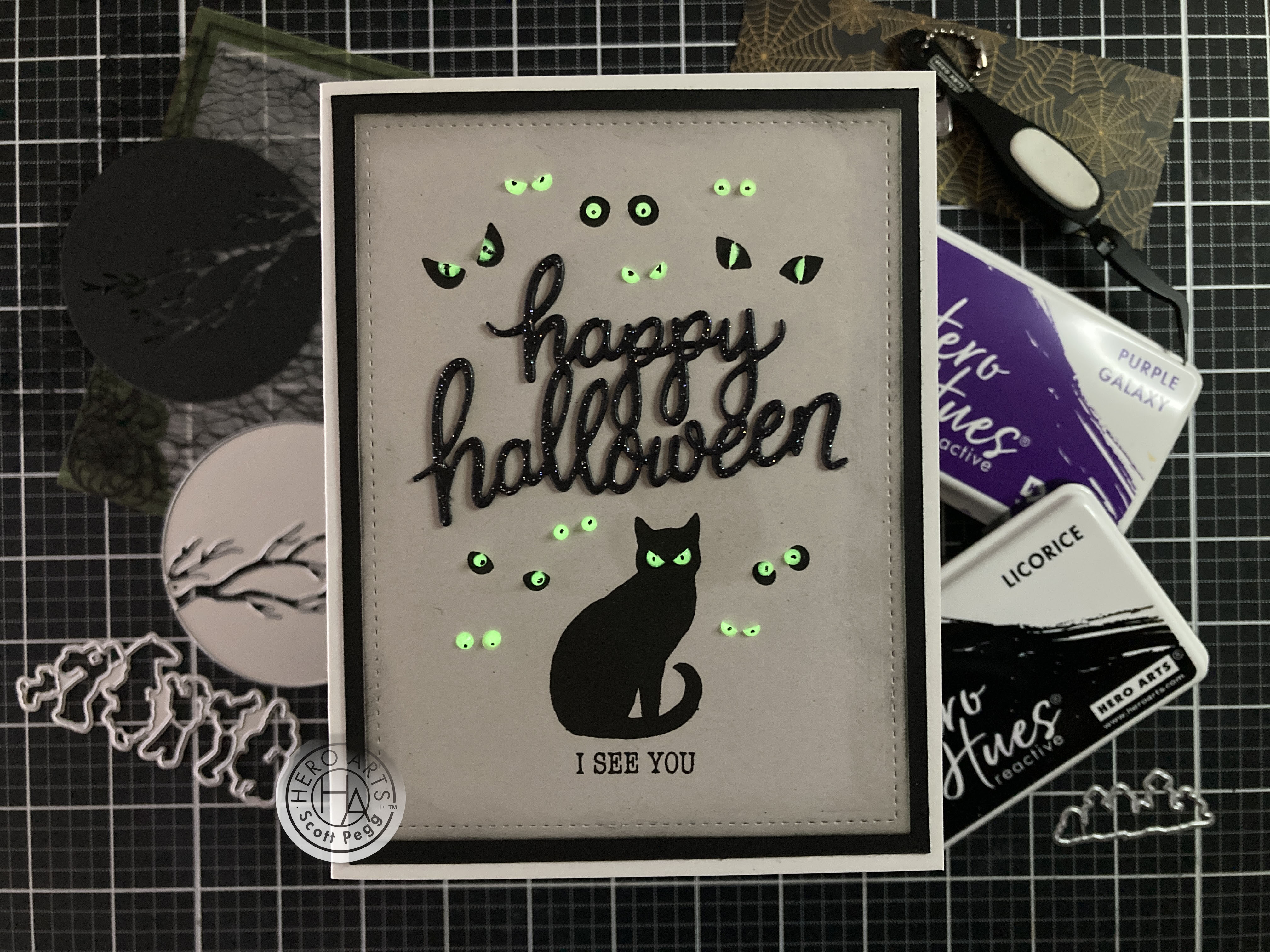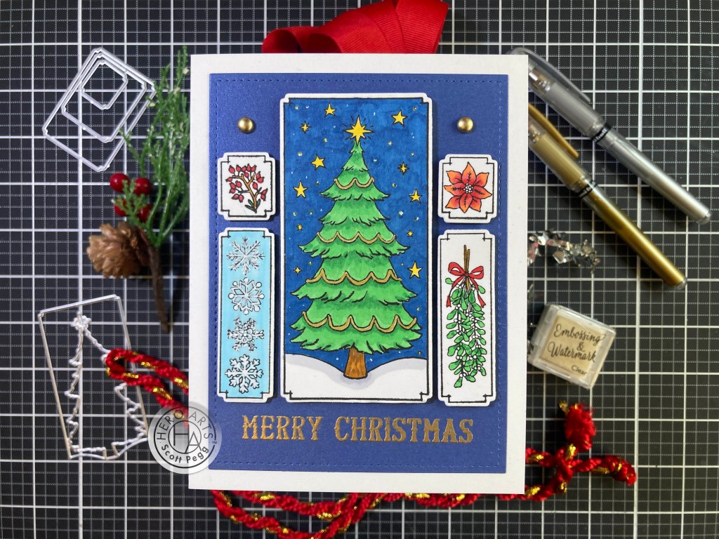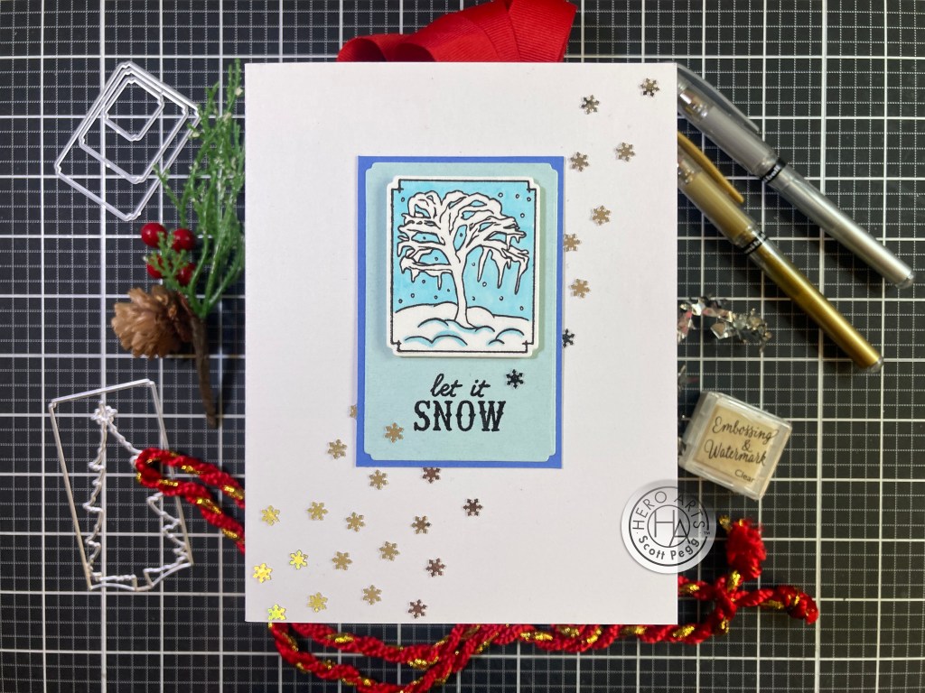 I die-cut the stamped panel with a 3.25″ x 4.5″ Lawn Fawn Stitched Rectangle die and added a thin Green mat behind that and glued them to a White card base. I stamped the sentiment with HA Apple Green Reactive ink and embossed that with Clear Embossing powder. I arranged the images on top and glued them directly to the card front. I fussy-cut the single Pothos leaf and added that to the plant with some foam tape for some added dimension, and colored in the mushroom dots with a Sparkle Gel pen. The single leaf actually adds a great amount of depth, and I love the plant growing out of the trunk.